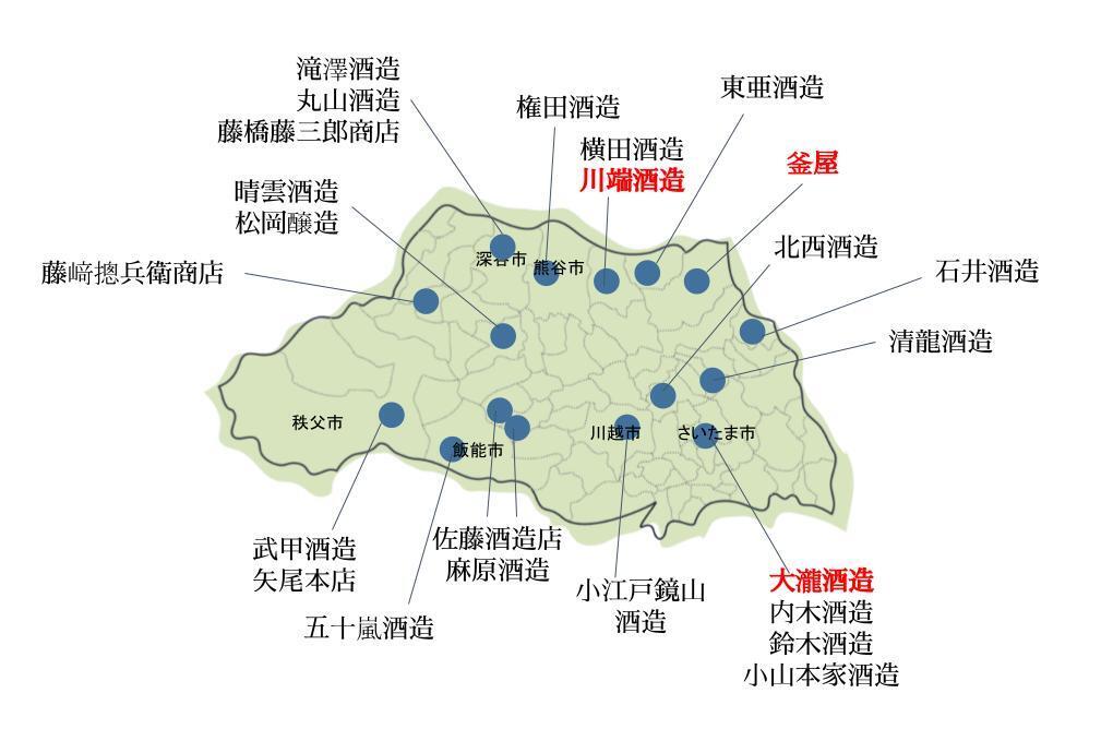 第二回各酒蔵のご紹介は、埼玉県北部に位置する釜屋さんと川端酒造さん、南部さいたま市に位置する大瀧酒造さんです。