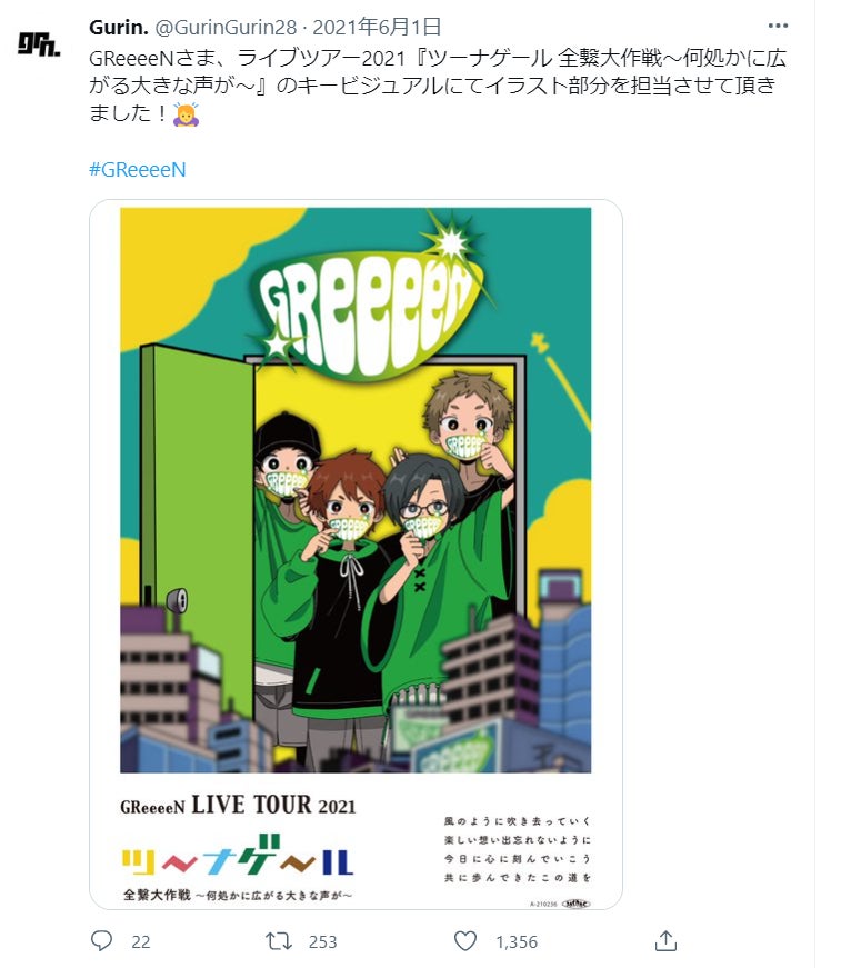 高校時代からTwitter上にイラストを投稿し続け、歌い手さんのイラストを担当するなど活躍の場を広げてきました。そしてミュージシャンGReeeeNのライブツアー2021「ツーナゲール 全繋大作戦〜何処かに広がる大きな声が〜」のキービジュアルイラストを担当し、一躍大注目のイラストレーターになりました。