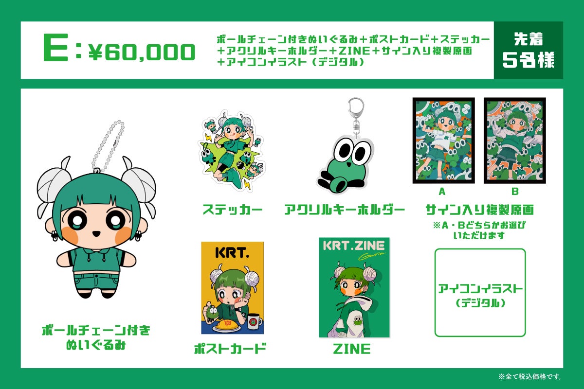 ぬいぐるみボールチェーン+限定ポストカード+ステッカー+アクキー+ZINE20p+サイン付複製原画+アイコンイラスト(デジタル)+アナログ色紙(カラー)5名