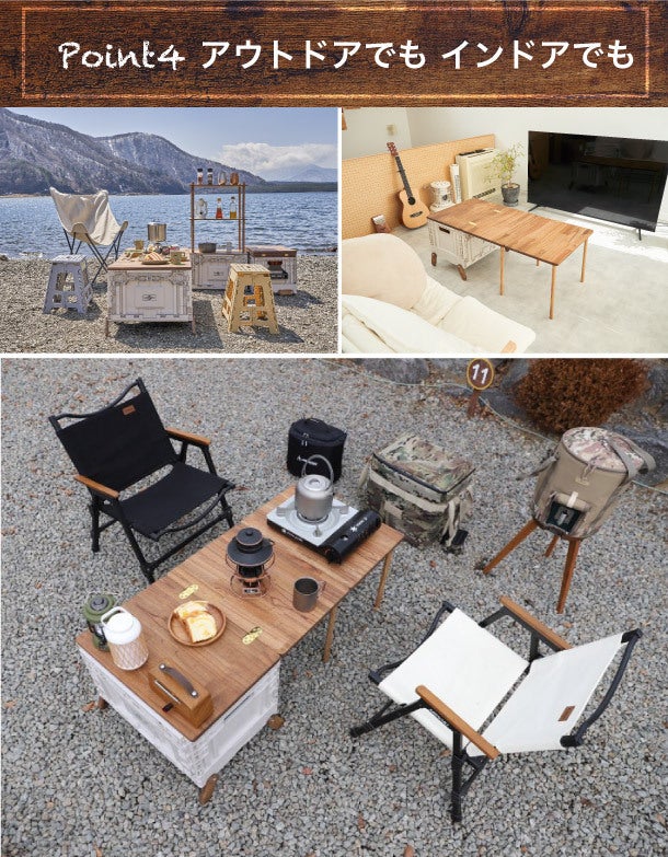 その収納力と利便性は使う場所に制約を持ちません。アウトドアでもインドアでもその能力を十分に発揮します。アウトドアでは広いテーブルとして、ゆとりのあるキャンプが行えます。