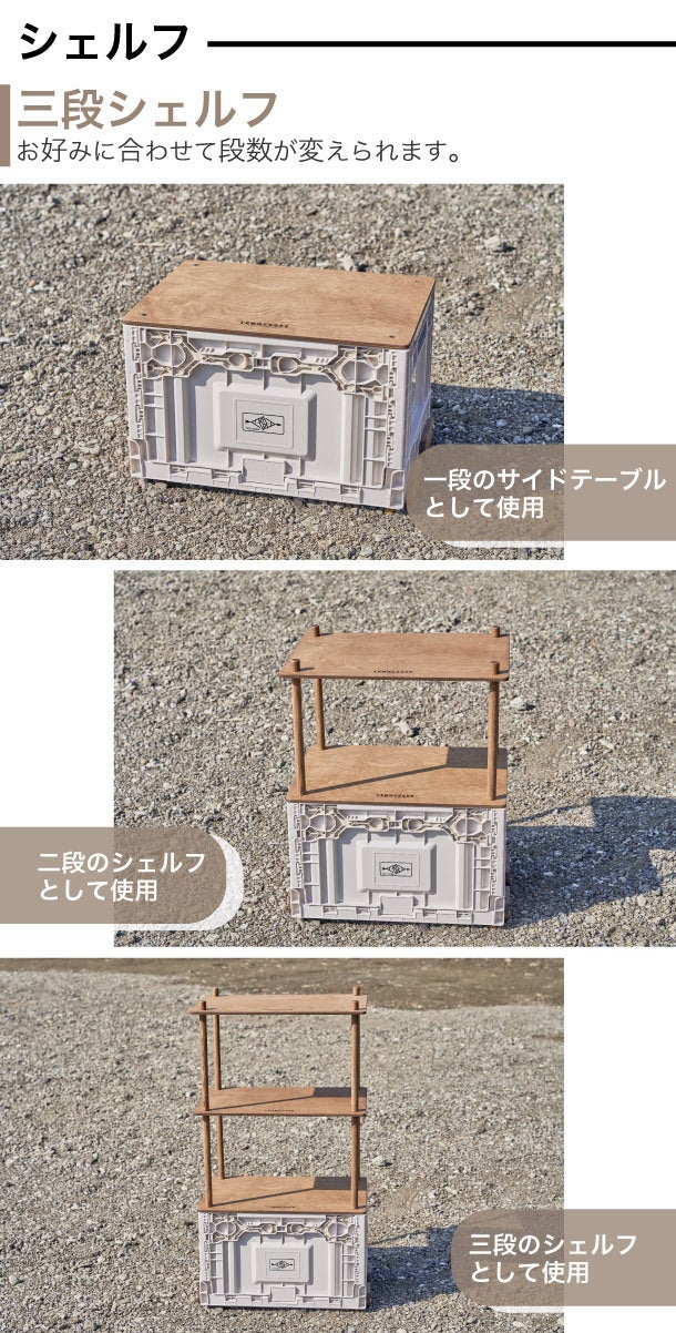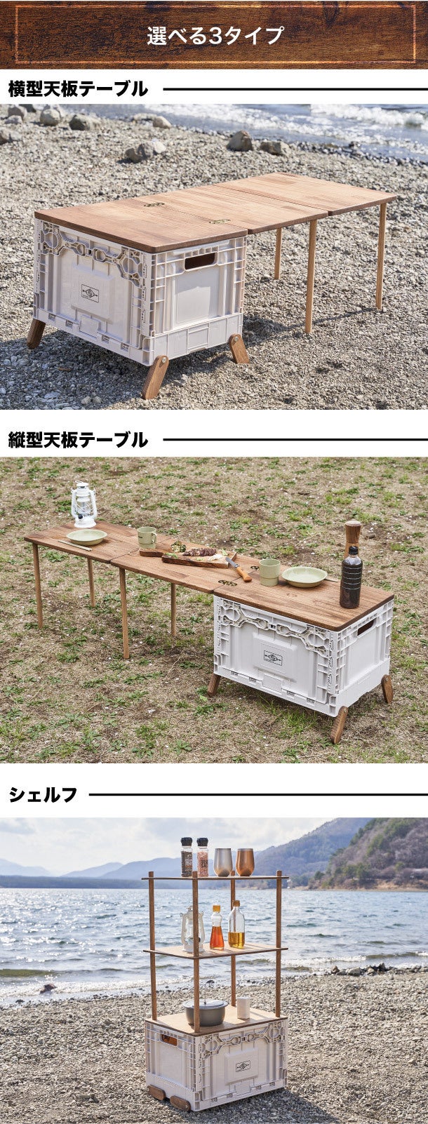 横型天板テーブルと縦型天板テーブル、シェルフの3つからお選びいただけます。テーブルは奥行きを確保した横型と長さを確保した縦型。どちらも使い勝手が良くなるよう設計されています。シェルフは3段となっており、アウトドアにおいて便利な棚としてご利用いただけます。あなたのお好みはどちらですか?