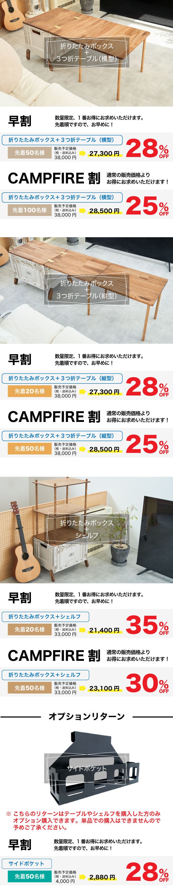 2022/10/02 14:51サポーターの皆様 この度はフォールディングボックスの新しいカタチ「テネシーキャンピングの三つ折テーブル」プロジェクトにご支援いただき誠にありがとうございます!本日、製品を配送手配しましたことをご報告いたします。日本郵便のゆうパックにて発送手配しております。数日以内にお届けします。今しばらくお待ち頂けると幸いです。製品到着後、内容をご確認ください。万が一付属品が足りない、初期不良など、商品に関して何かございましたらご連絡ください。引き続き、どうぞよろしくお願いいたします。テネシーキャンピング チーム一同 もっと見る【感謝】無事終了しました。応援ありがとうございました!