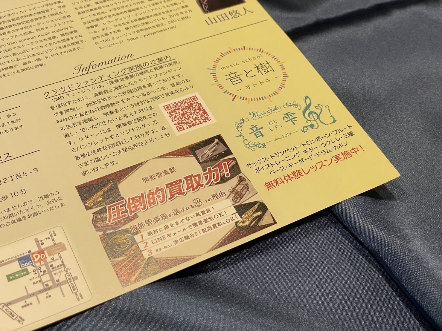 2022年11月12日開催「AFFECTION!2本のサクソフォーンとピアノでお送りする、愛の調べ」」の公演パンフレットにご希望のチラシを挟み込み、配布します。プロジェクト終了後、発送に関する詳細をご案内致します。11月上旬までに弊社まで郵送願います。チラシのサイズはA4サイズ1枚となります。音楽を愛好する方にダイレクトに届きます。演奏会チラシやCDチラシ等、既に印刷物がある方にオススメです。チラシは、最大200枚まで承ります。上記演奏会で余った分は、YMD MUSIC WEB SHOPの楽譜出荷時に挟み込みます。