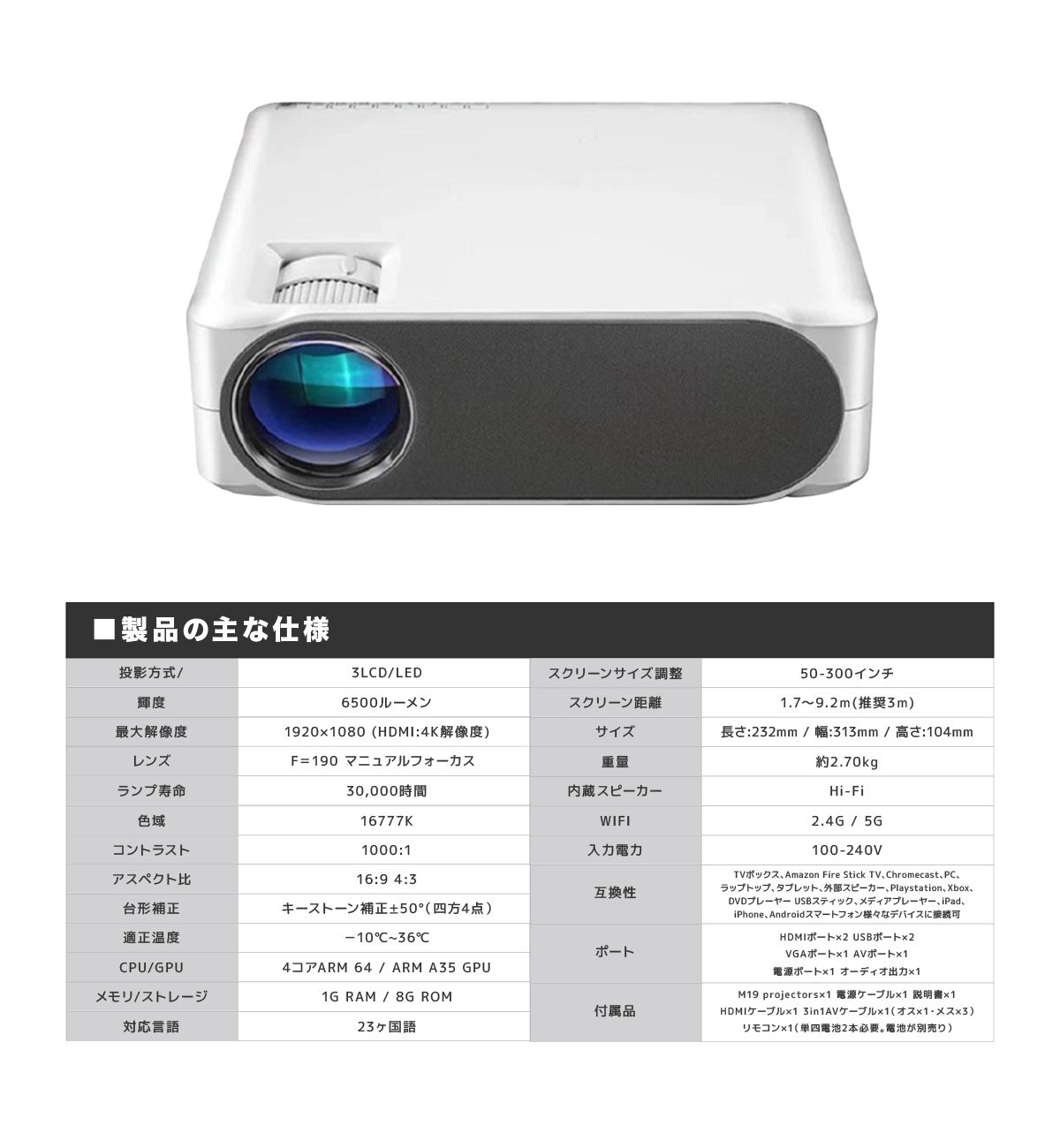 ❶驚異の明るさ6500ルーメン。最大300インチの迫力の大画面!