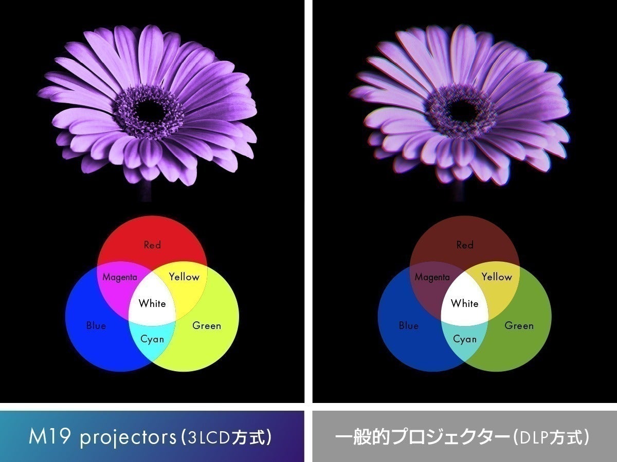 3LCD方式は、白もカラーも同じ明るさになるのも特徴です。