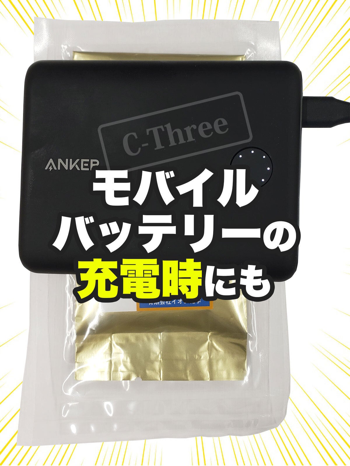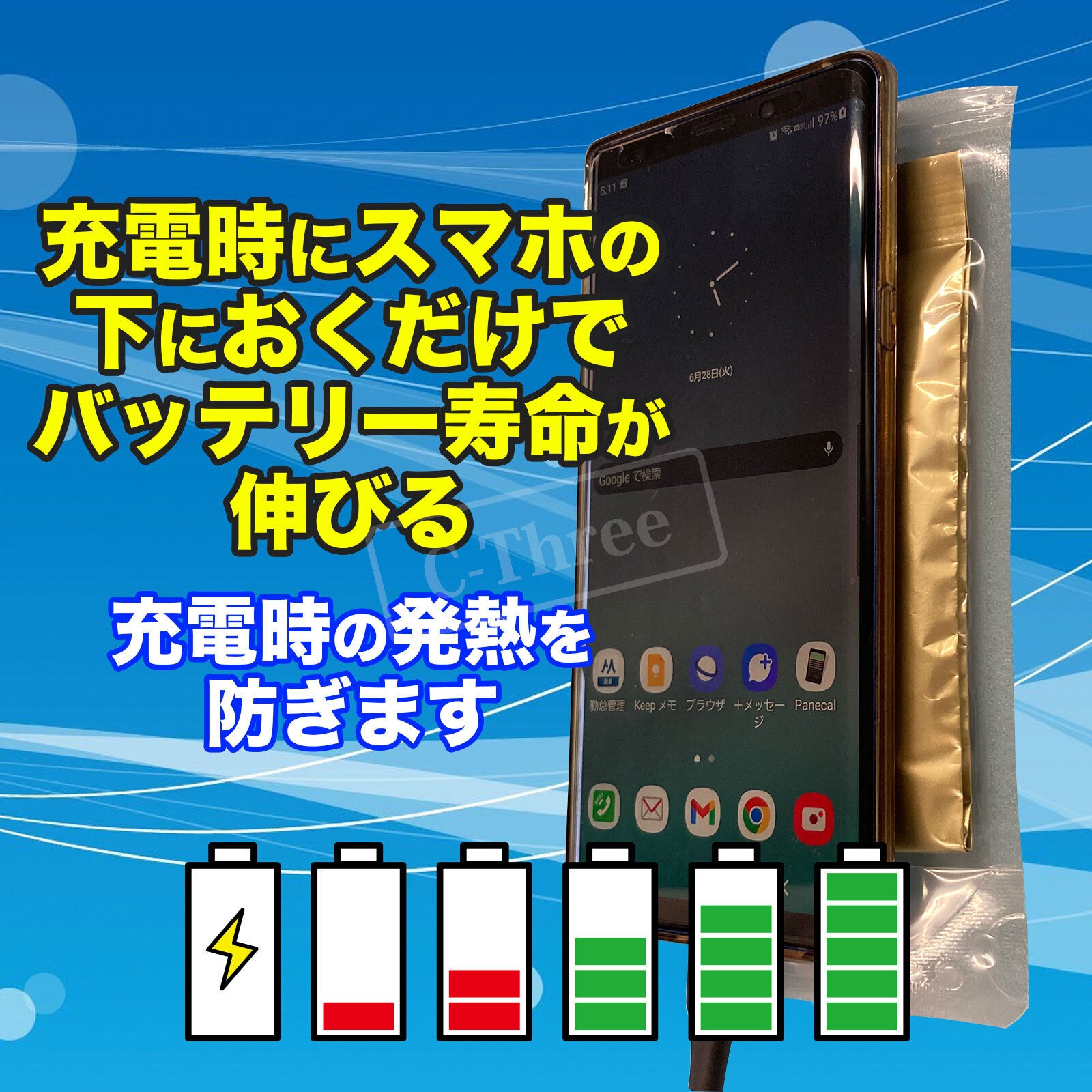 アルミ蒸着パックに入っている溶媒和電子が充電時のリチウムイオン電池に作用し発熱を抑え、寿命を延命させます。
