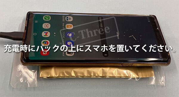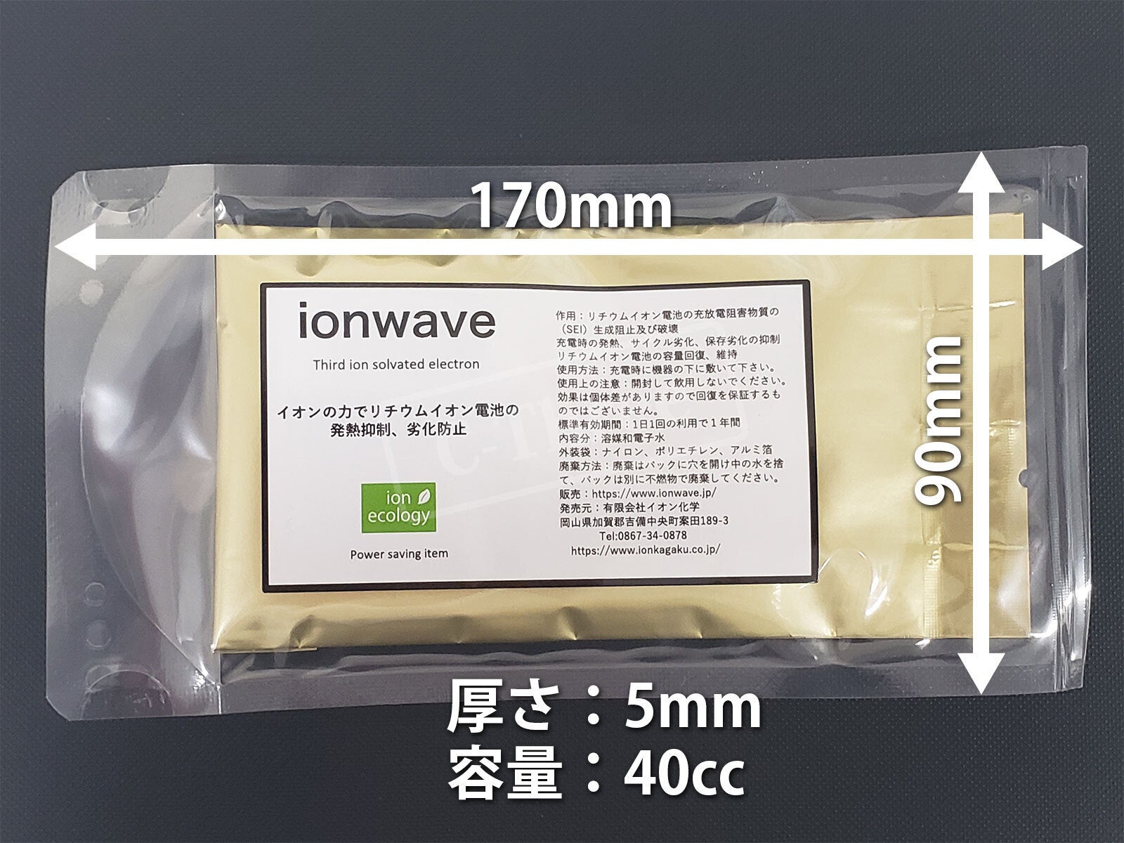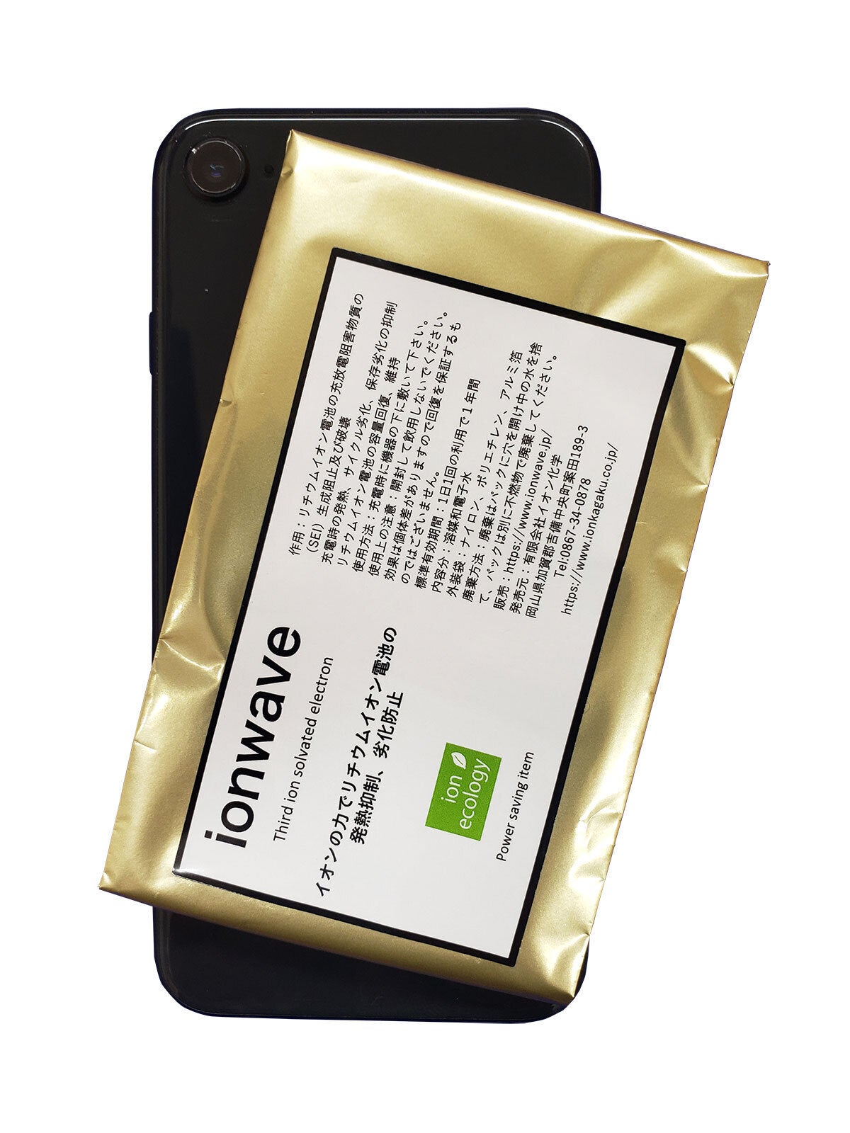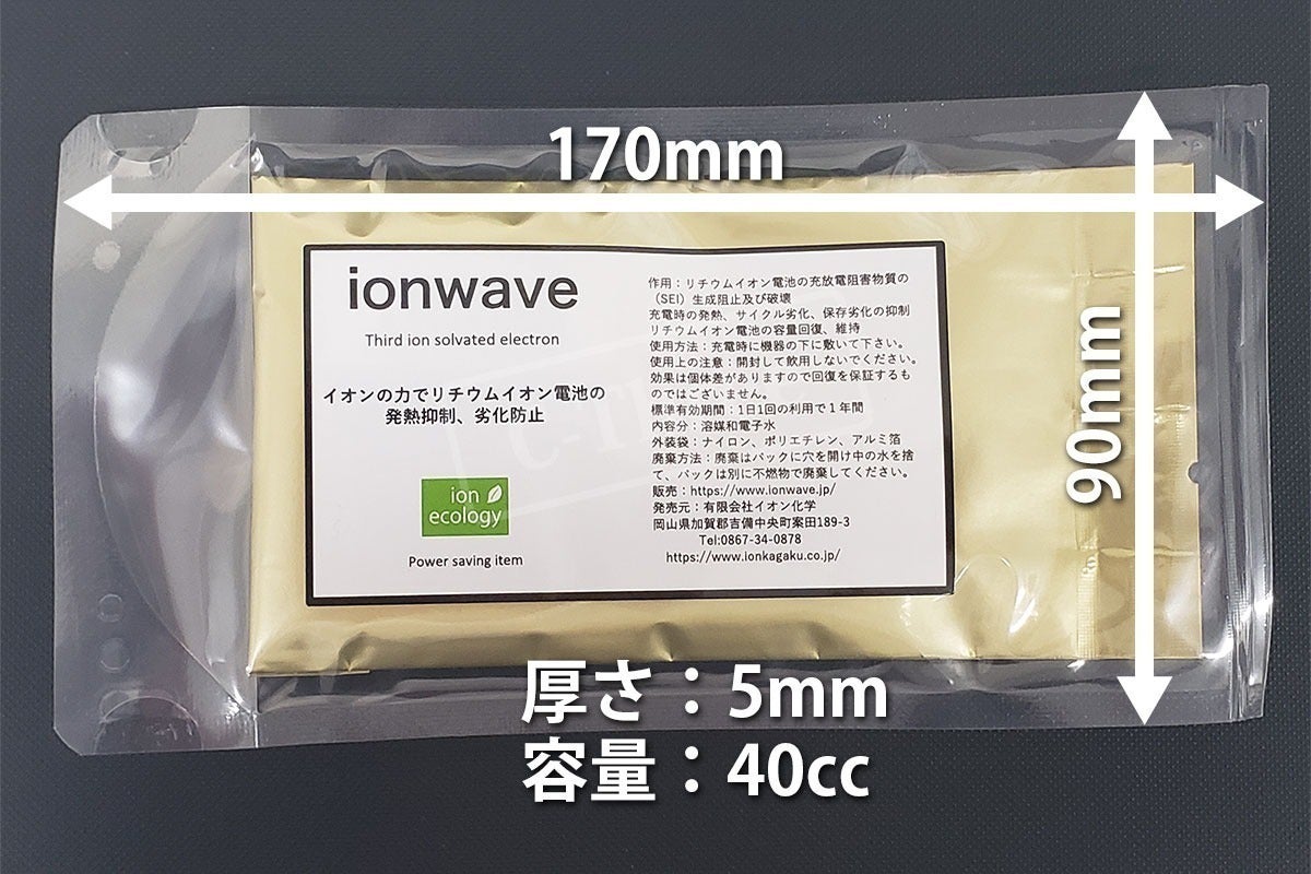 また溶媒和電子水パック(イオンウェーブ)の特徴として、電池と装置の中間に絶縁物等が存在しても、粒子ではなくエネルギー波のため、作用には影響が出ませんので、ワイヤレス充電器Qi(チー)や充電器の下に設置することでも利用可能です。