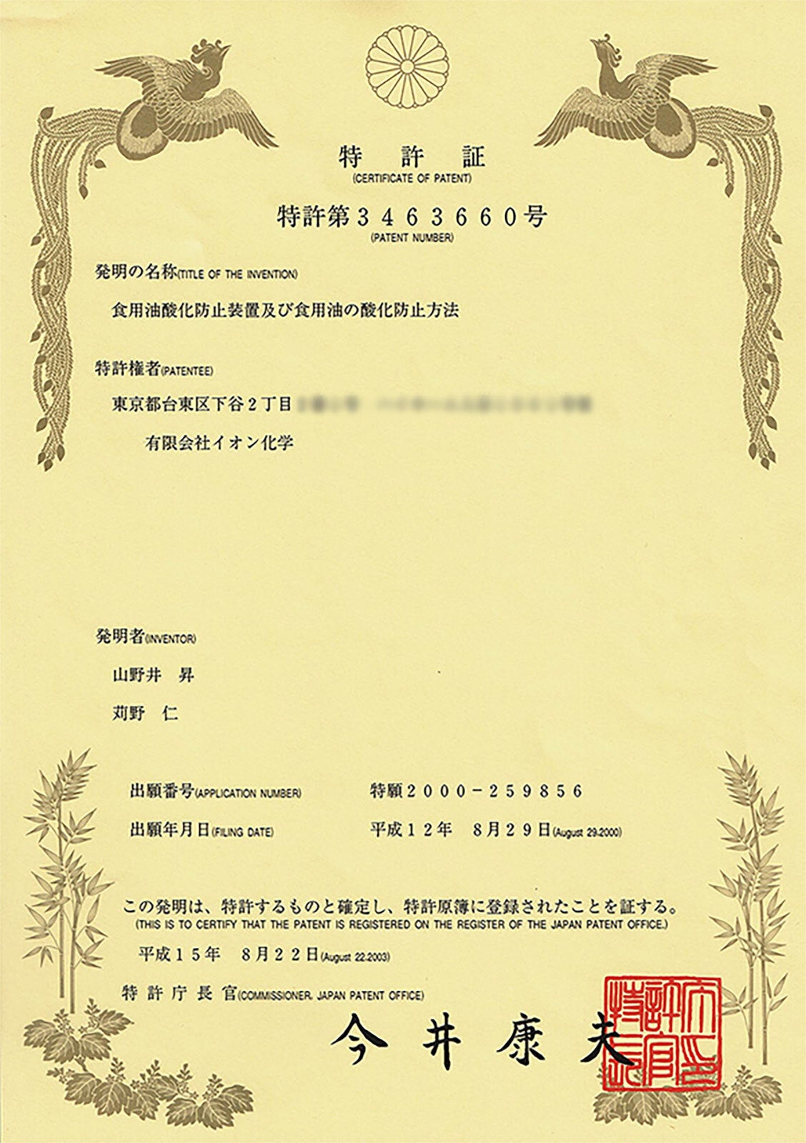 特許:第3463660号は食用油酸化防止装置及び食用油の酸化防止方法で取得されました。この技術は溶媒和電子の生成及び長期保存ができる、世界でも類を見ない特許技術です。