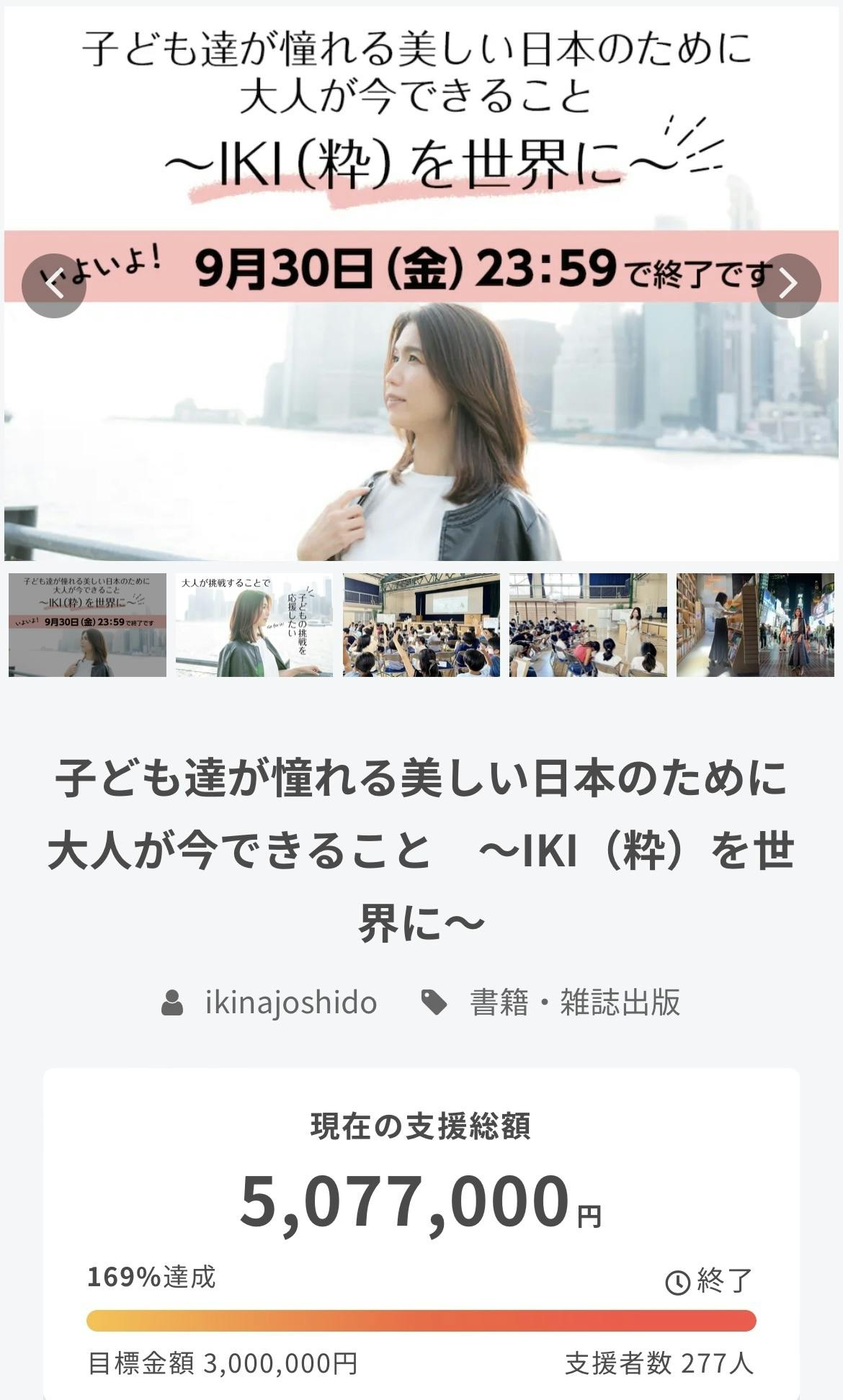 2022/10/01 13:342022年8月21日からスタートしました「子ども達が憧れる美しい日本のために大人が今できること 〜IKI(粋)を世界に〜」のクラウドファンディングが9月30日23時59分をもちまして終了しました。スタート当初から、皆さまのご支援、応援メッセージが大きな力となり、277名の方々から、目標金額を超える169%のご支援をいただきました。皆さまから寄せられた想いに胸が熱くなりました。クラウドファンディングを通じて繋がってくださった皆さま、お一人おひとりに、チーム一同、心より感謝申し上げます。代表の稲垣沙織より、ご支援いただきました皆さま、応援してくださった皆さまへ、お礼とご挨拶をさせていただきます。ーーーーーーーーーーーーーーーーーーーーーーーーーーーーーーーーーーーーーーーーーーこの度はプロジェクトへご支援いただきまして本当にありがとうございました。クラウドファンディングへの初挑戦ということで不安もありましたが、皆様からの温かいご支援、メッセージでたくさんの勇気をいただき最後までやりきることができました。挑戦している時にかけていただいた応援のお言葉がどれほど力になったことか、改めて応援の素晴らしさをチームみんなで感じることができました。心より感謝申し上げます。そして、チームの仲間がいたからこそ達成できた今回のプロジェクト。この1ヶ月以上それぞれの役割で、時に悩みながらも一緒に走り切ってくれた素晴らしい仲間に心から感謝しております。応援すること、応援されること、このどちらも体感したお仲間たちは社会でもまたそのあり方で応援できる大人になっていくと思います。クラウドファンディングは終了となりますが、ここからまたスタートです。みなさまからの応援を力にして、子ども達が憧れる美しい日本のために、そして人生のミッションでもあります「子ども達が憧れる素敵な大人創り」のため、できることに挑戦し続けていきます。来年NY出版となる初の書籍も楽しみにしていただけたら嬉しいです。その他リターン商品でこれからお会いできる方もどうぞよろしくお願いいたします。お会いできますこと楽しみにしております。今後の活動もクラウドファンディングのサイト内、活動報告にて配信させていただきますので引き続きご覧いただけますようお願いいたします。たくさんのご支援・応援本当にありがとうございました。粋な女子道創始者 稲垣沙織ーーーーーーーーーーーーーーーーーーーーーーーーーーーーーーーーーーーーーーーーーーー・今後の活動は引き続き、こちらのクラウドファンディングのサイト内、活動報告ページでご報告致しますので、これまでと同様にご覧いただけますと幸いです。・リターン商品につきましても活動報告ページ、クラウドファンディング内のみなさまへのメールにてお知らせ致します。楽しみに今少しお待ちいただけますと、ありがたく存じます。ーーーーーーーーーーーーーーーーーーーーーーーーーーーーーーーーーーーーーーーーー挑戦する人を応援し、美しい日本を未来へ繋げていくために、先ずは私たち一人ひとりが、「美しい日本を未来に繋げるために何ができるか?」を問いかけながら、これからも挑戦することを楽しんで参ります。皆さまからの心のこもったご支援、ご声援、ありがとうございました。粋な女子道クラウドファンディング事務局チーム もっと見る