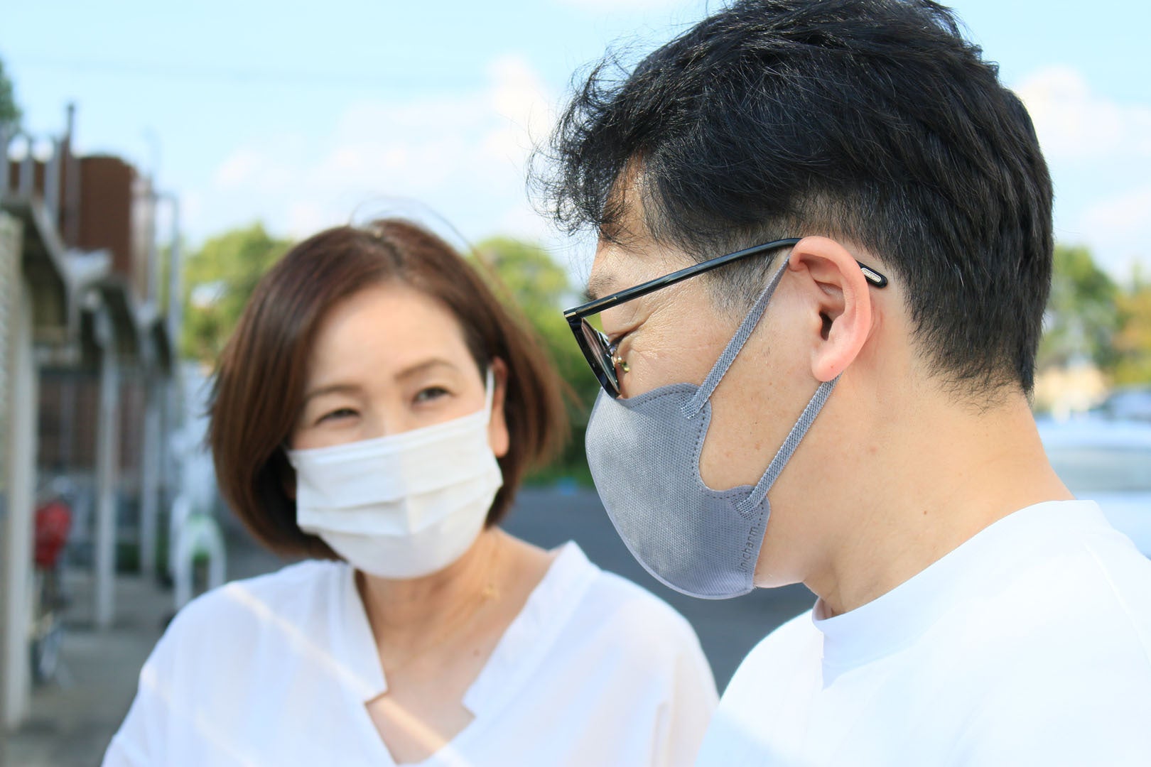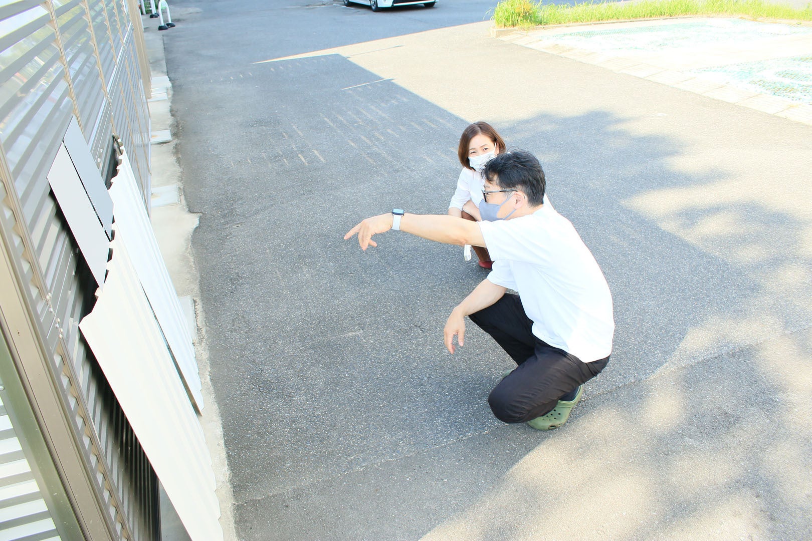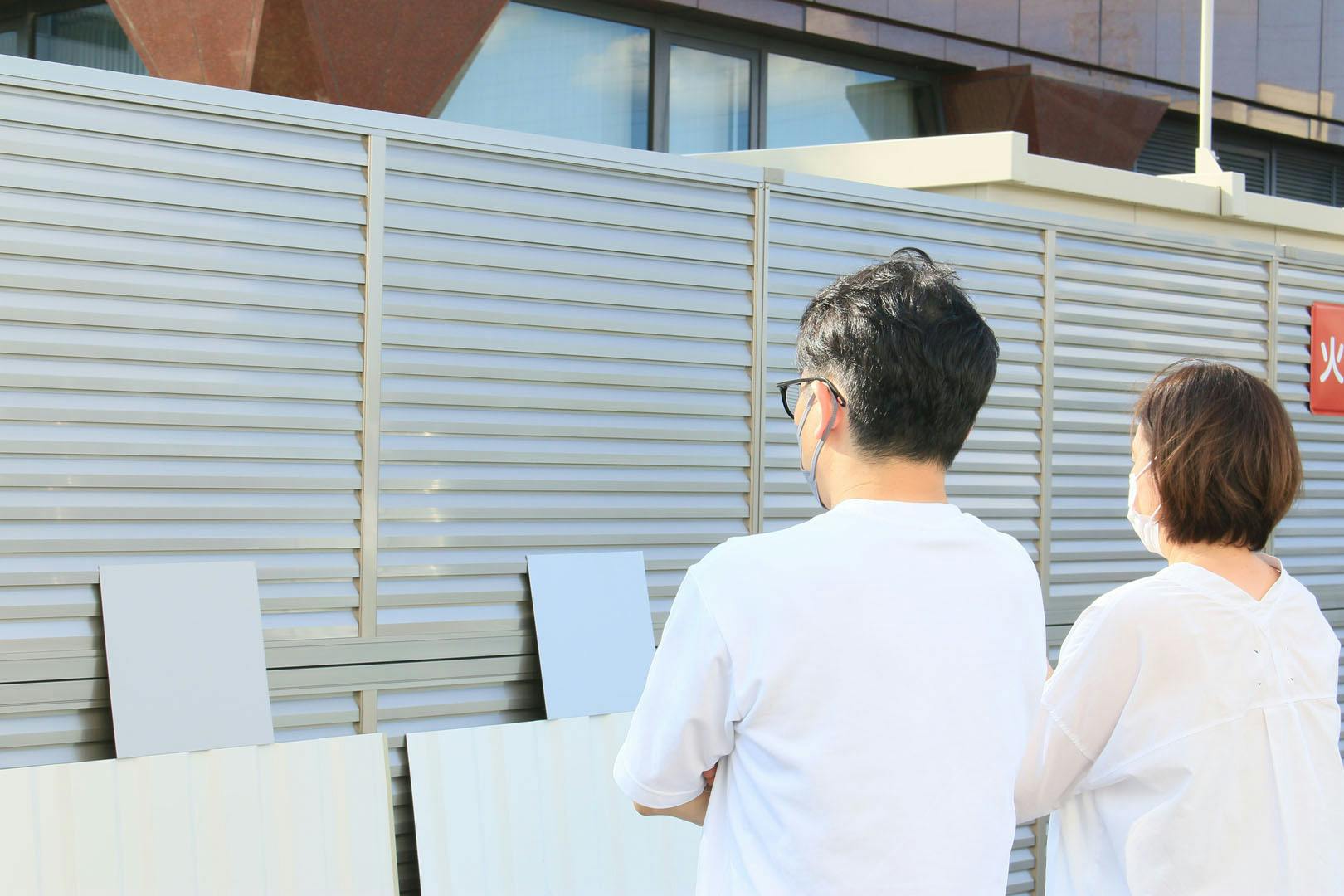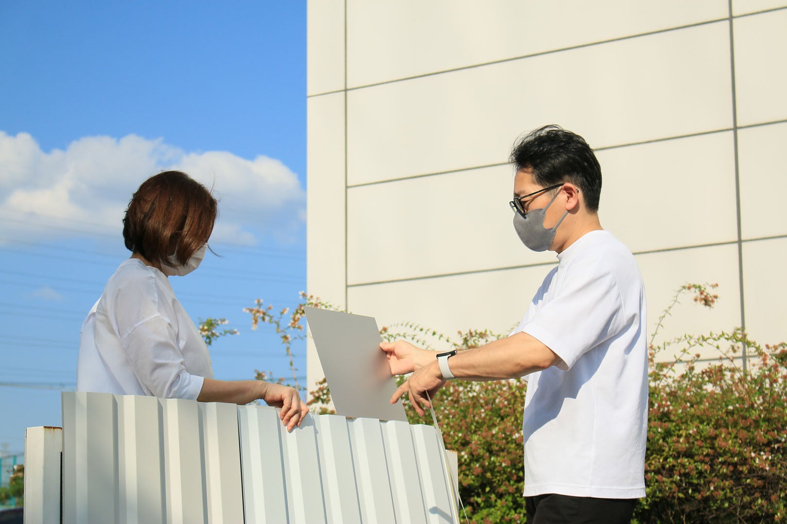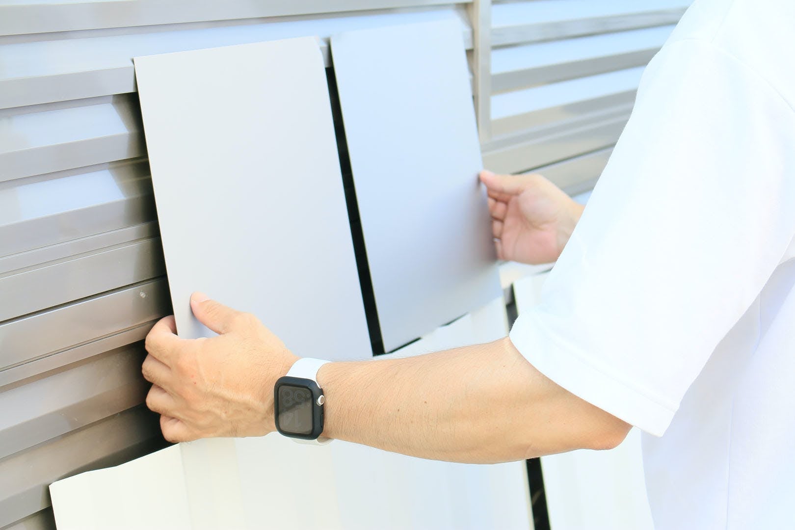 さて、先日ラボ事務所に届いた屋根と外壁の色サンプルを、出張からもどった社長とスタッフで外に運んで