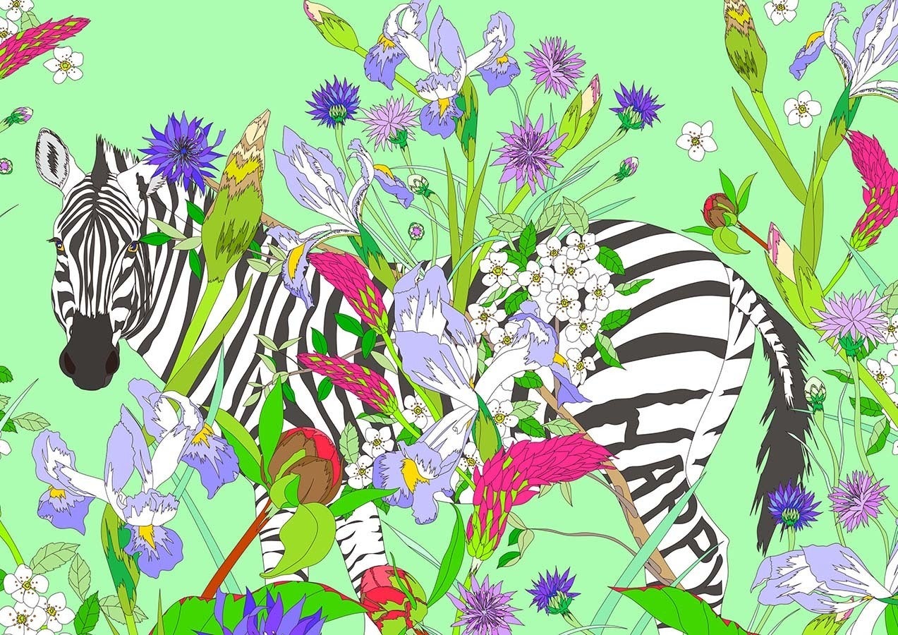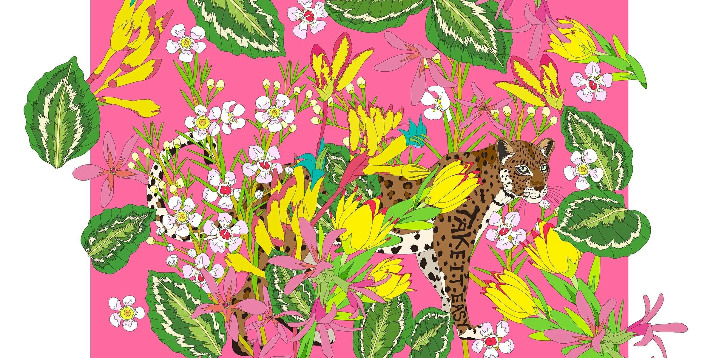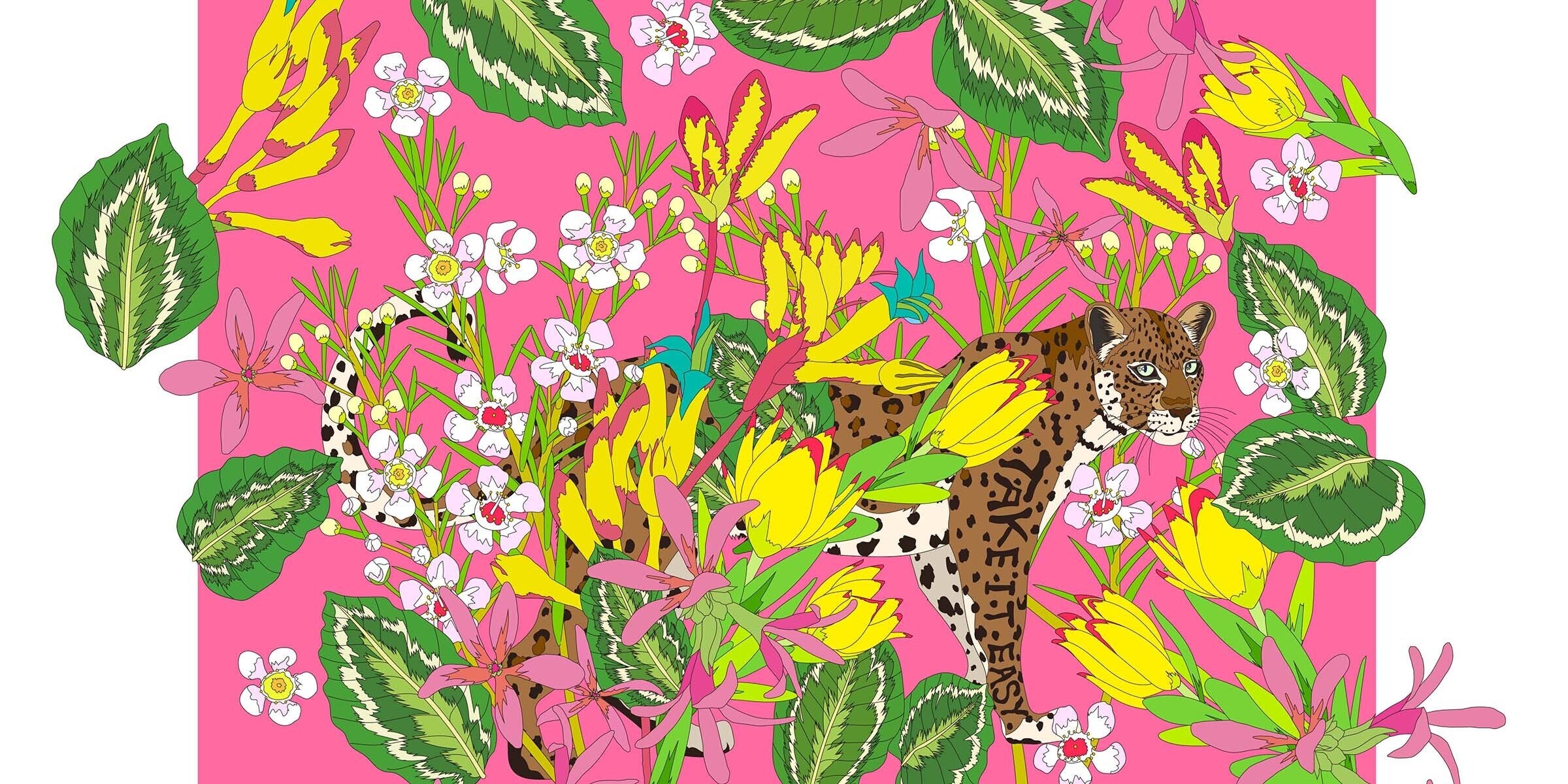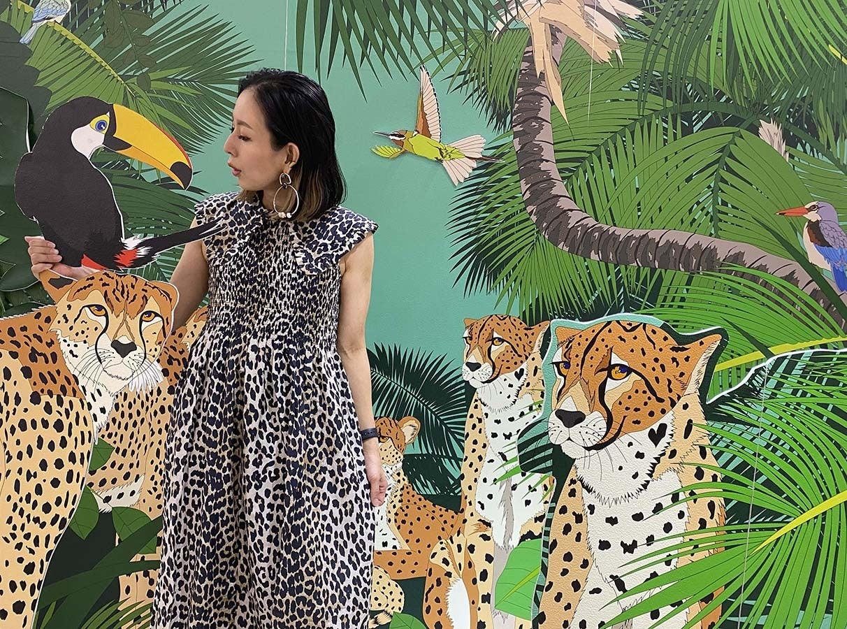 作品は常夏のジャングルをイメージした作品でカラフルに舞い散る花々と穏やかなヒョウの表情で楽しい夏の自然界を表現しました。