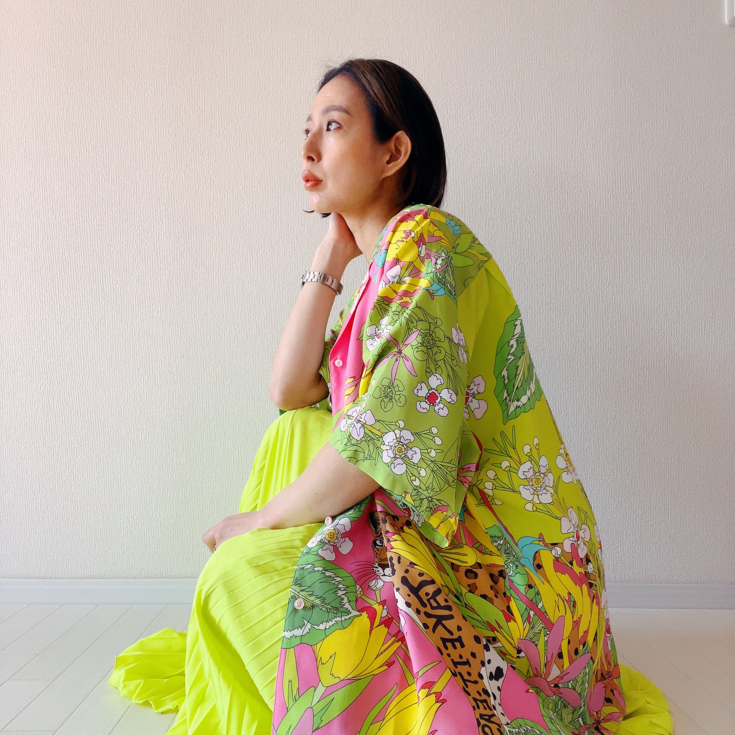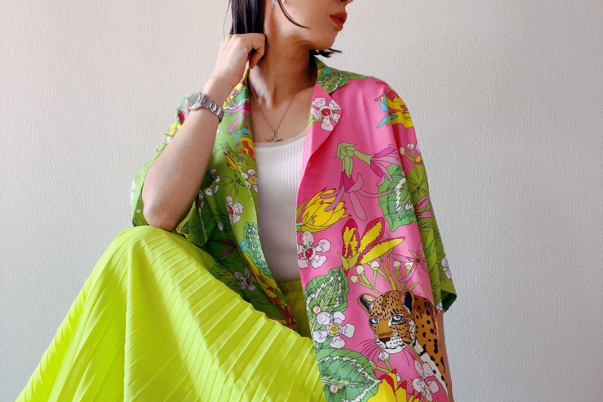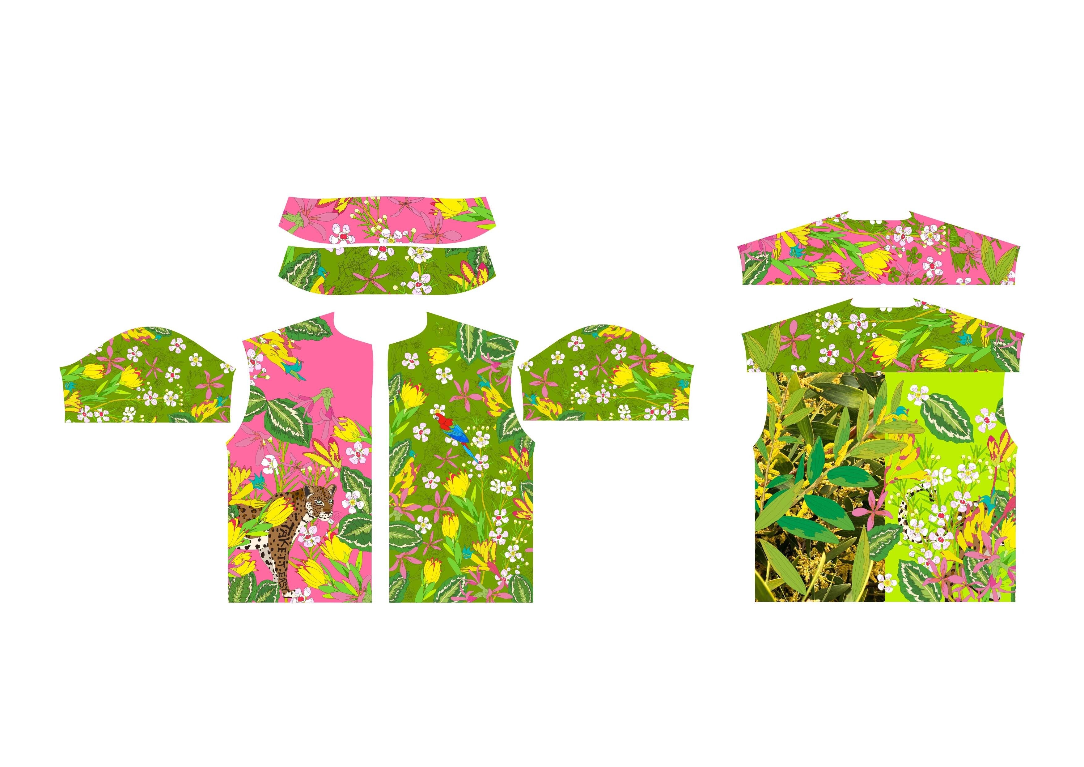 そしてデジタル捺染でしか表現できない写真とイラストを融合させて作品の3柄を配色を変え、前身頃左右、後ろ見頃、袖、襟の表裏など、それぞれデザインされている1着で、どこを見ても違う表情を楽しめます。