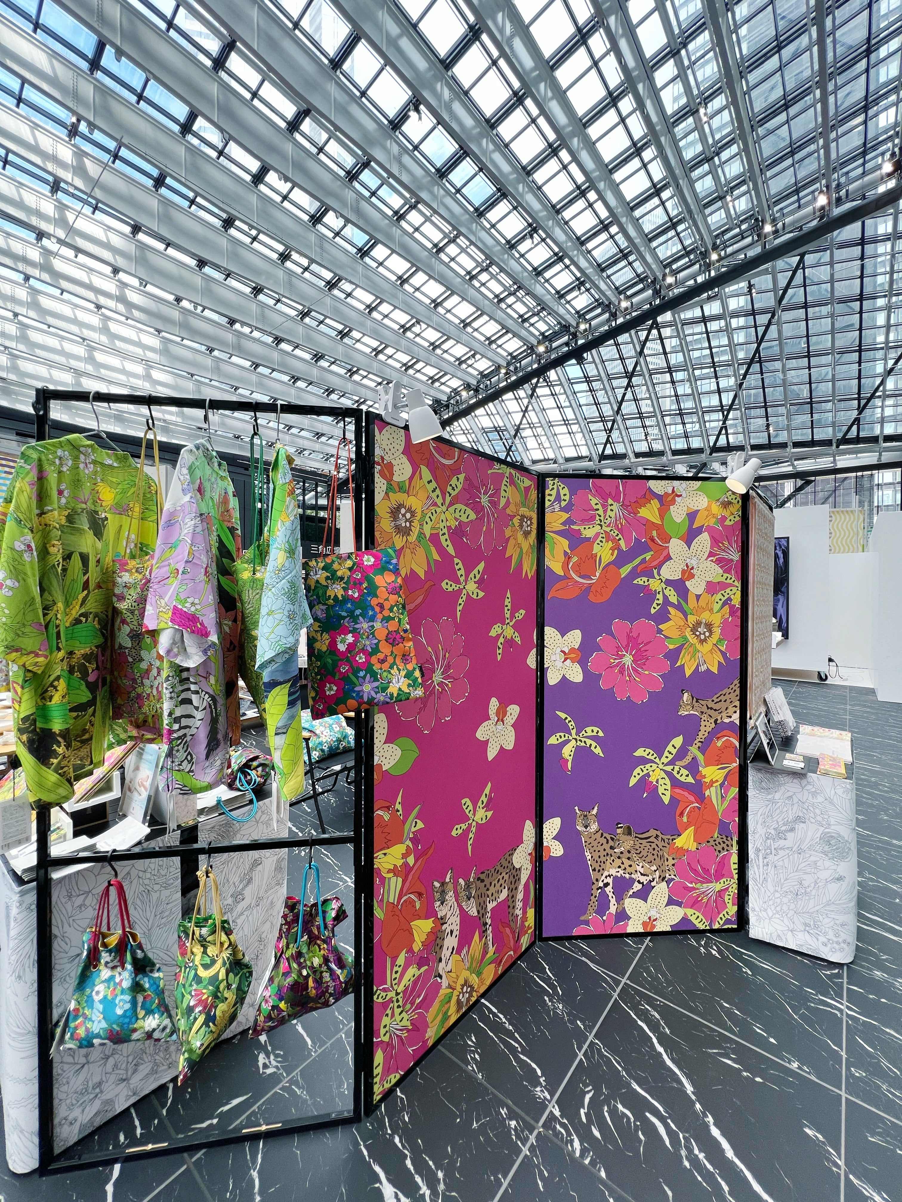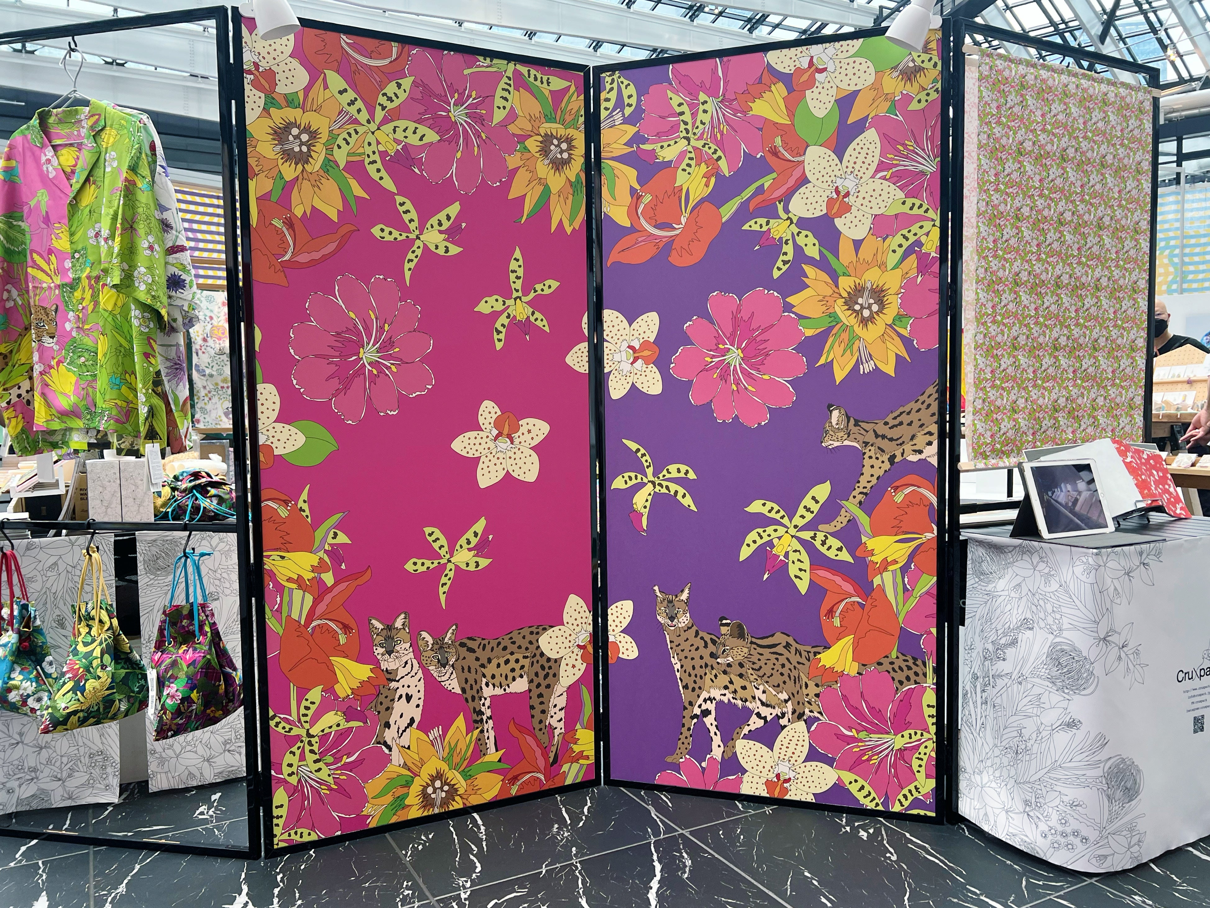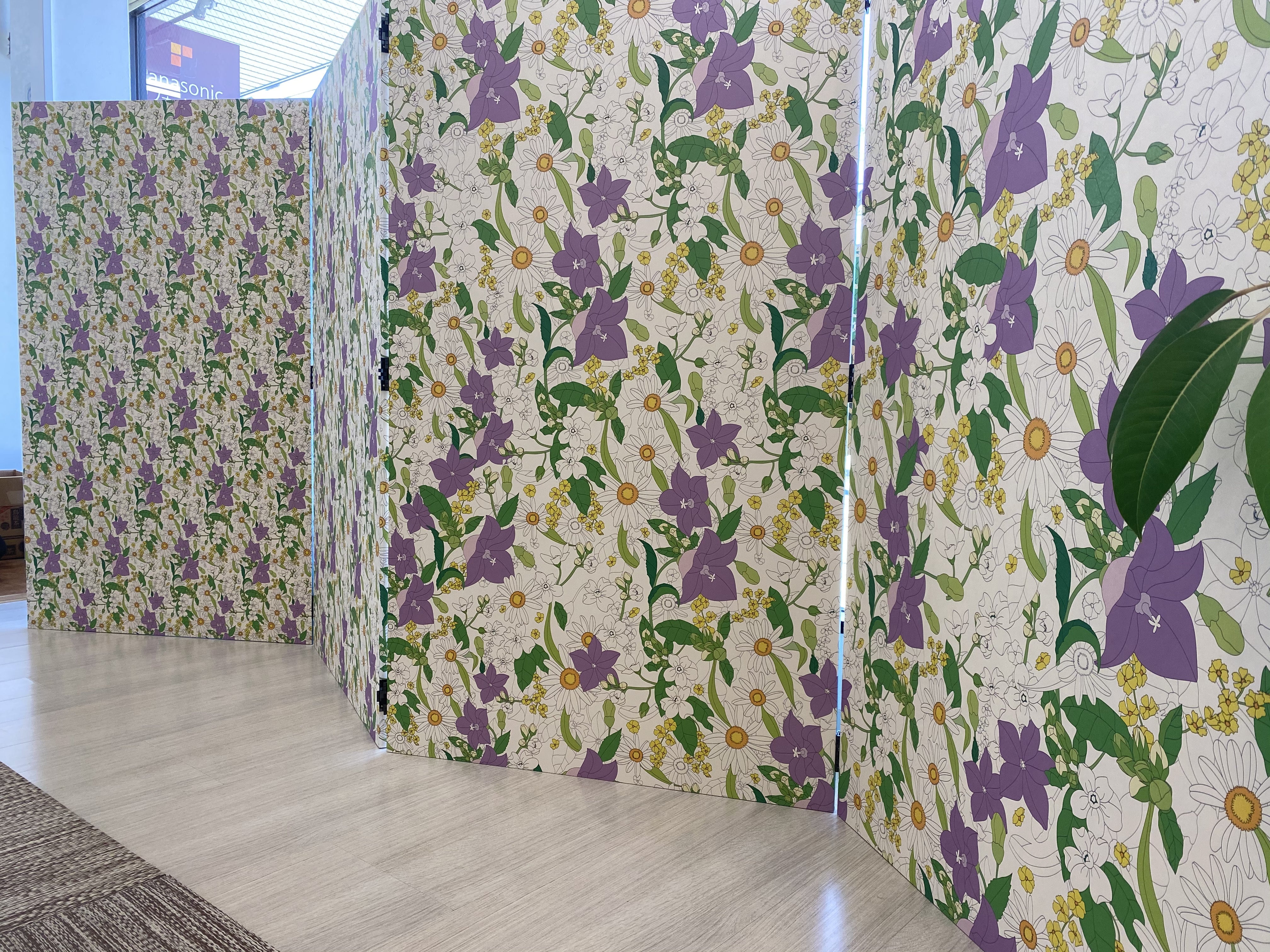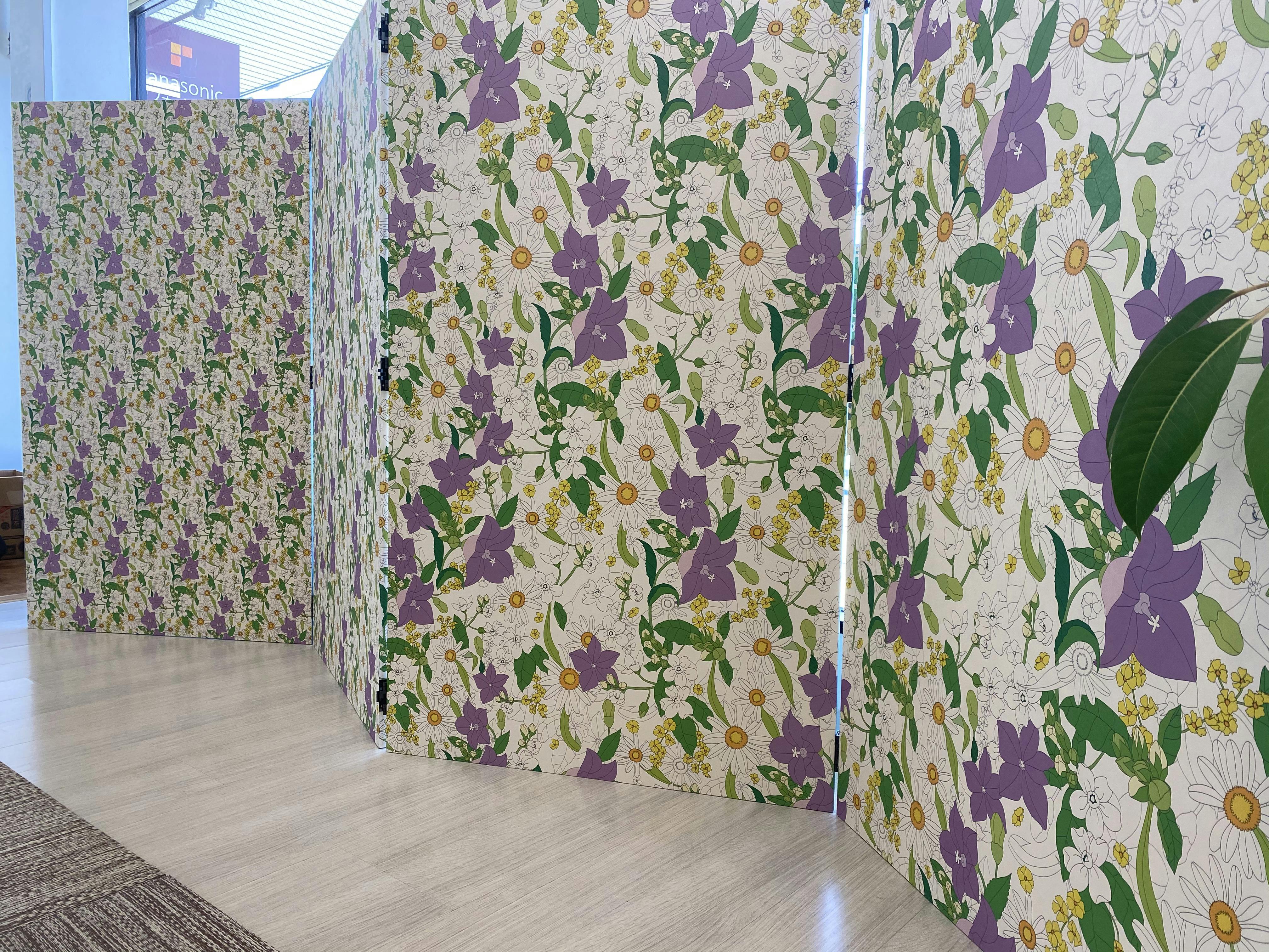 A-WISH株式会社「屏風」空間に奥行き、広がりを持たせる為、1面づつ花柄のサイズを変えたデザイン。