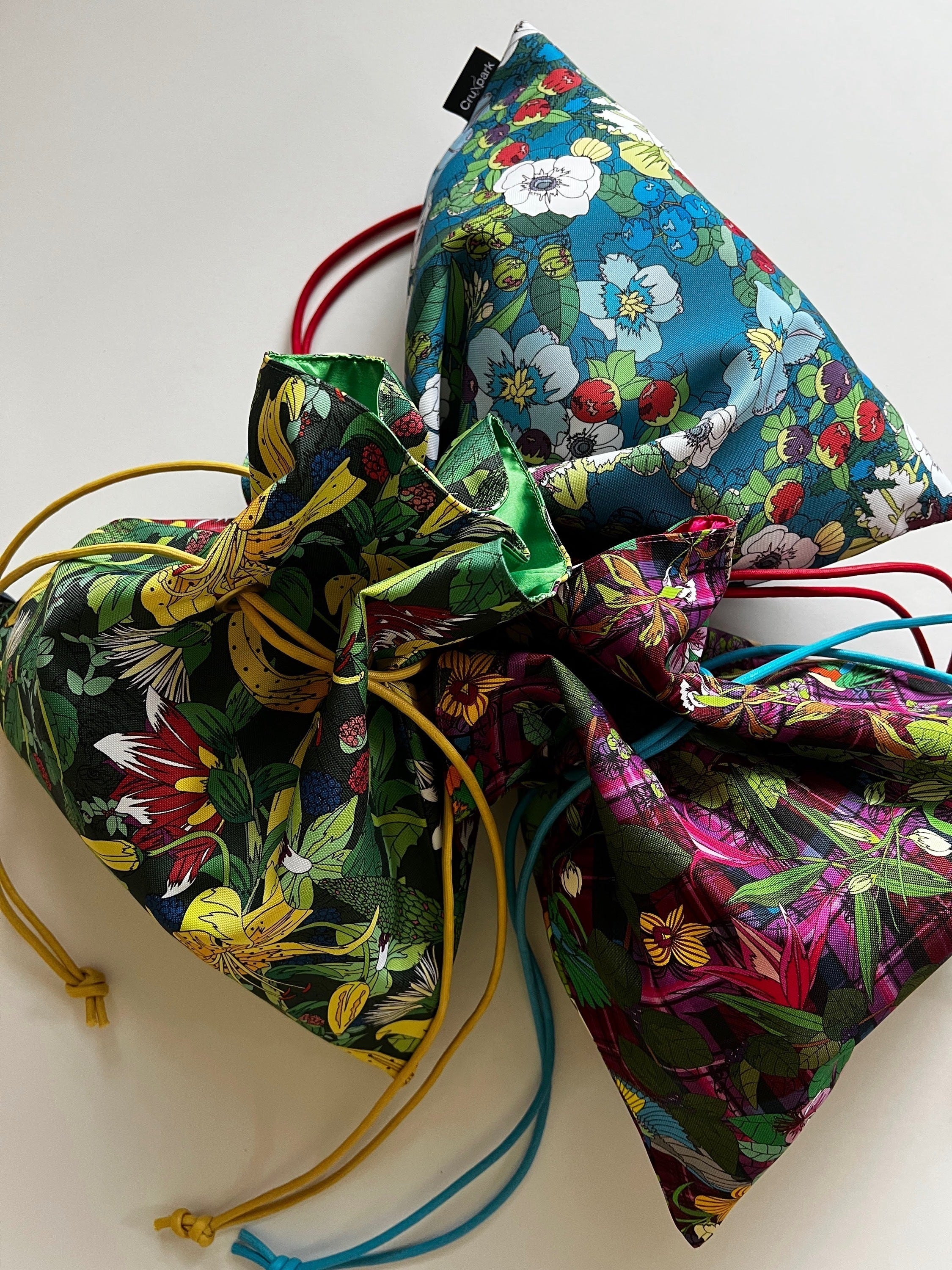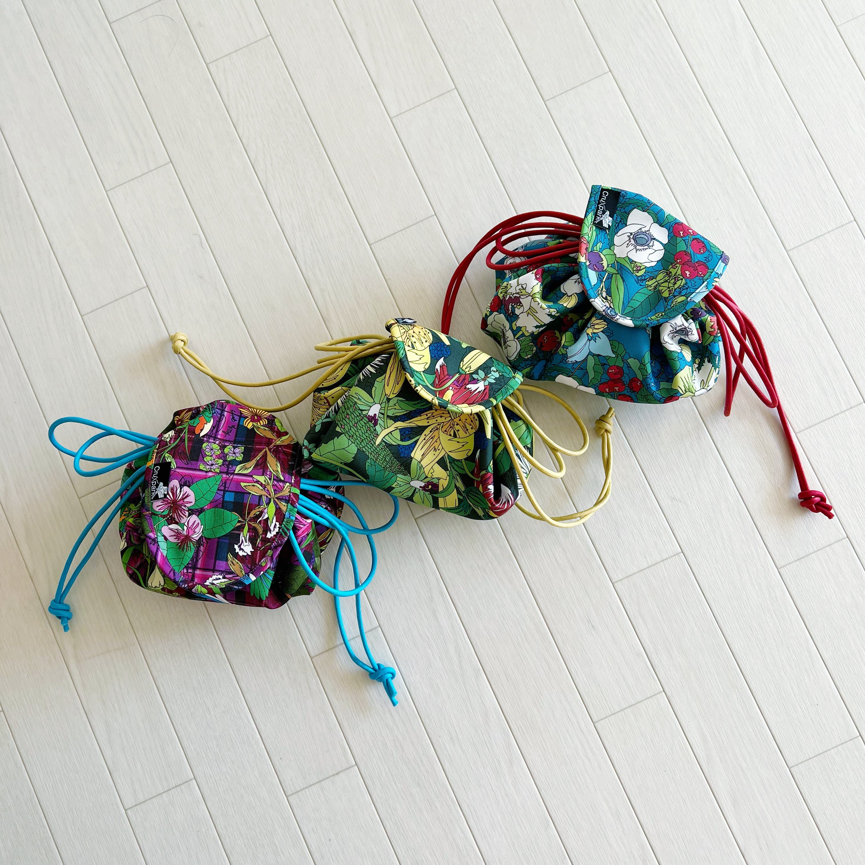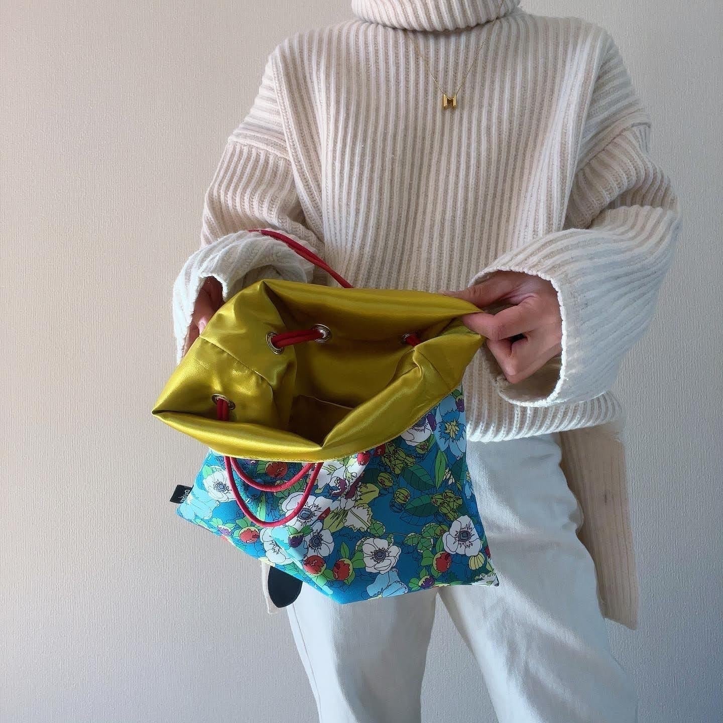 カラフルな絵柄と内側のサテン布、紐のカラー配色がとても綺麗でコーディネートのアクセントになります。