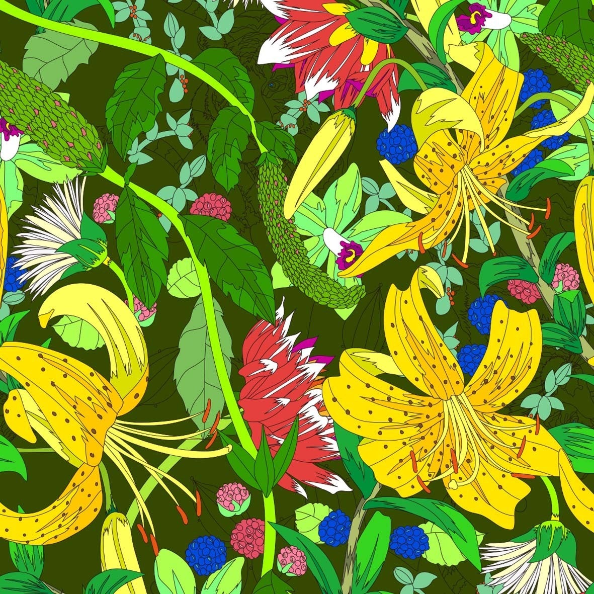 密林のジャングル奥地をイメージした作品で美しく咲くユリの花柄の奥で線画でタイガーがひっそり身を潜めています。
