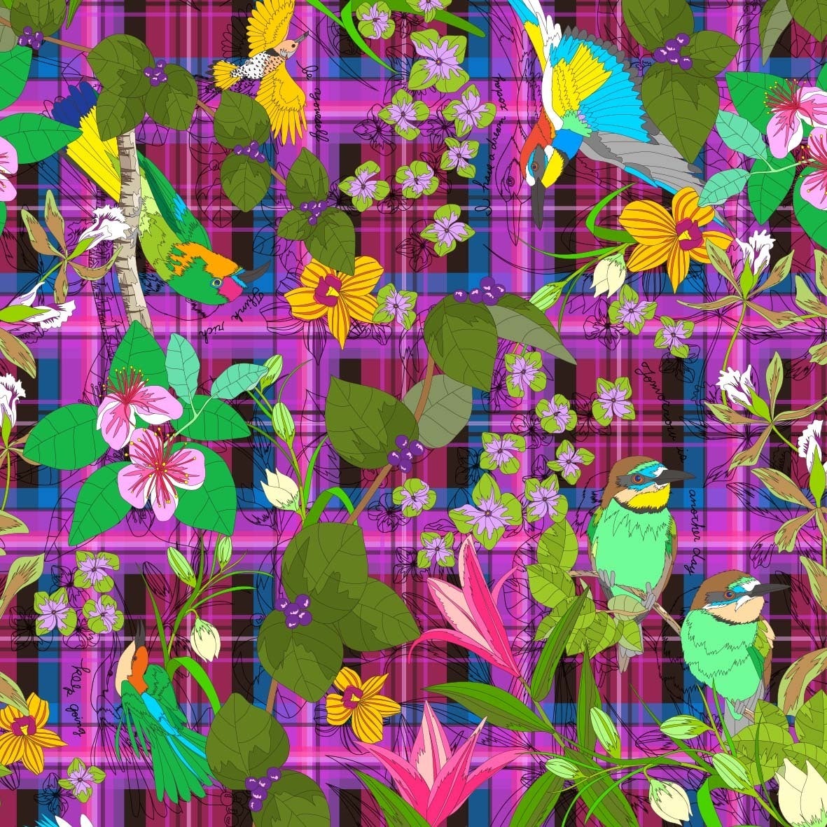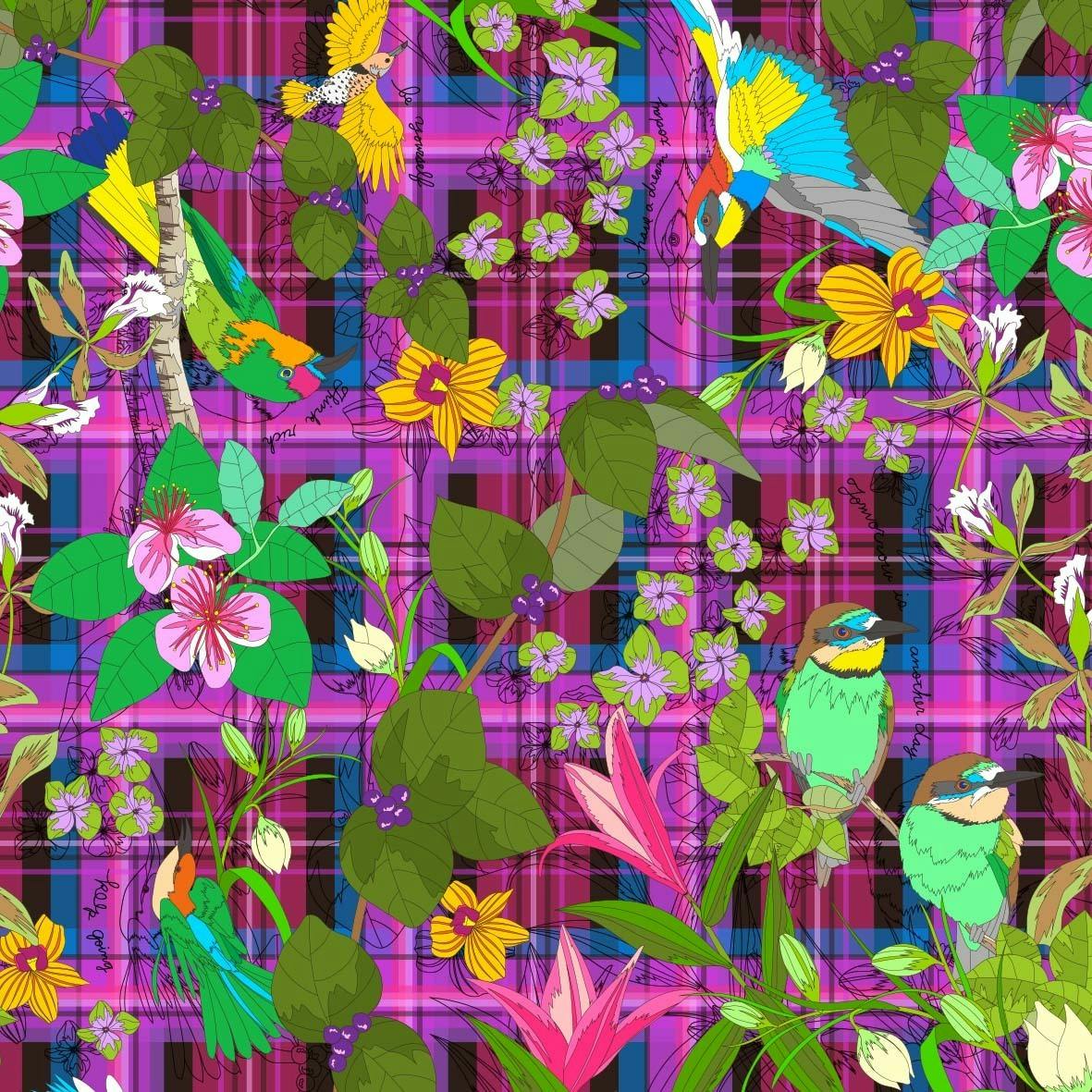 トレンドのチェック柄に小鳥と花柄を散りばめた図案で持っていてHappyになれるワードが隠されています。