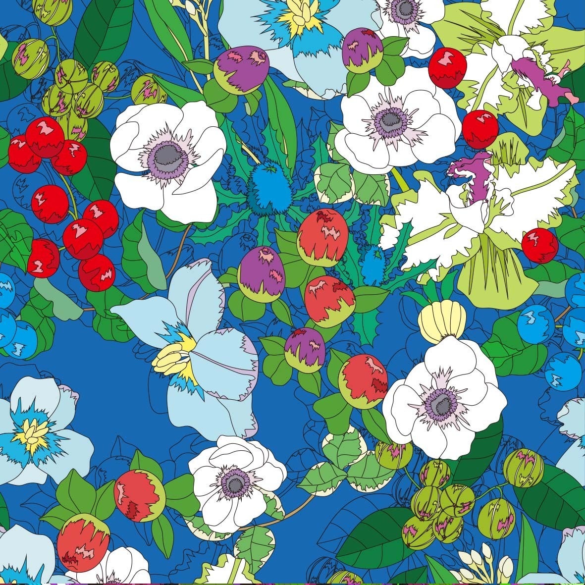 タイトルの通り、ベリーが主役の図案で芽が出て、茎が延び、花が咲いて実をつける花の一生を描きました。