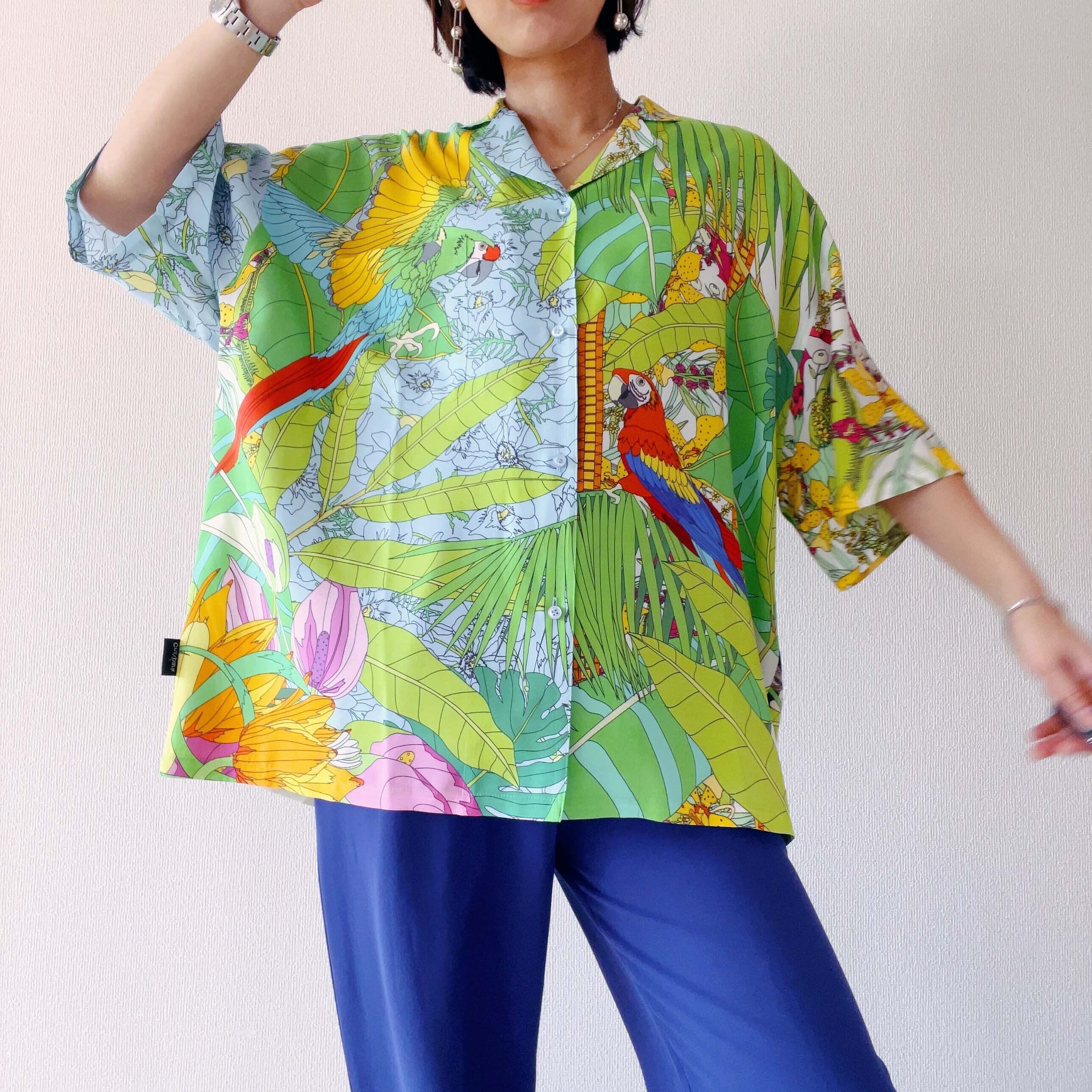 レーヨン素材でサラッとした着心地のアロハシャツ。色柄がとても綺麗でポイントです。夏は1枚で、秋冬は重ね着でインナーにしてもおしゃれに仕上がります。