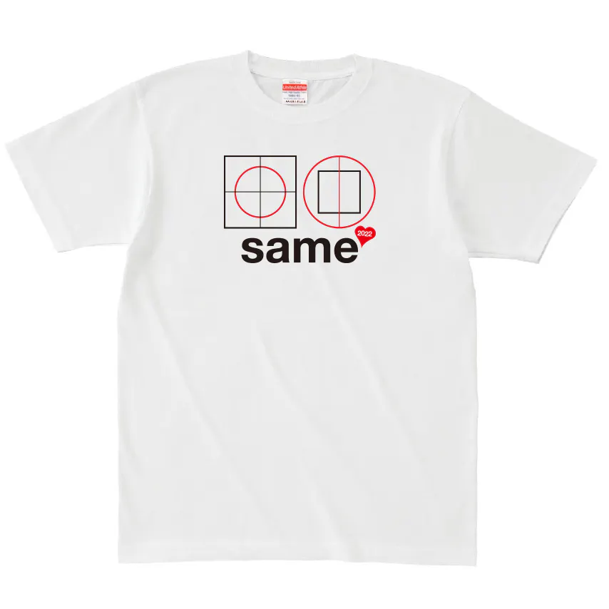 昭和の名コピー「違いがわかる男」が、平成になり「上質を知る人」になったような、差異への感性を磨くことには、なんらケチをつけるつもりはないのですが、昨今のささいな違いを指摘することでマウントを取ろうとする揚げ足取り競争がもたらす、不健全な「分断」に憂慮しています。そんなことで、今回のタナカヒロカズ運動全国大会2022のコンセプト「PEACE by the SAME !」を「渋谷の田中宏和さん」に表現してもらいました。今年ならではの限定感を出すために、あえて「2022」と入れています。○と□と赤と黒の組み合わせの二つの記号が、「だいたい同じ」のシンボルになっています。そして「田」「中」とも読めるようになっています。