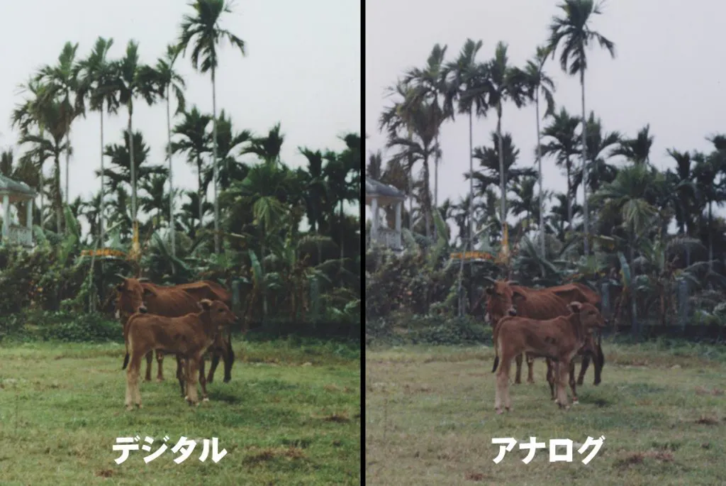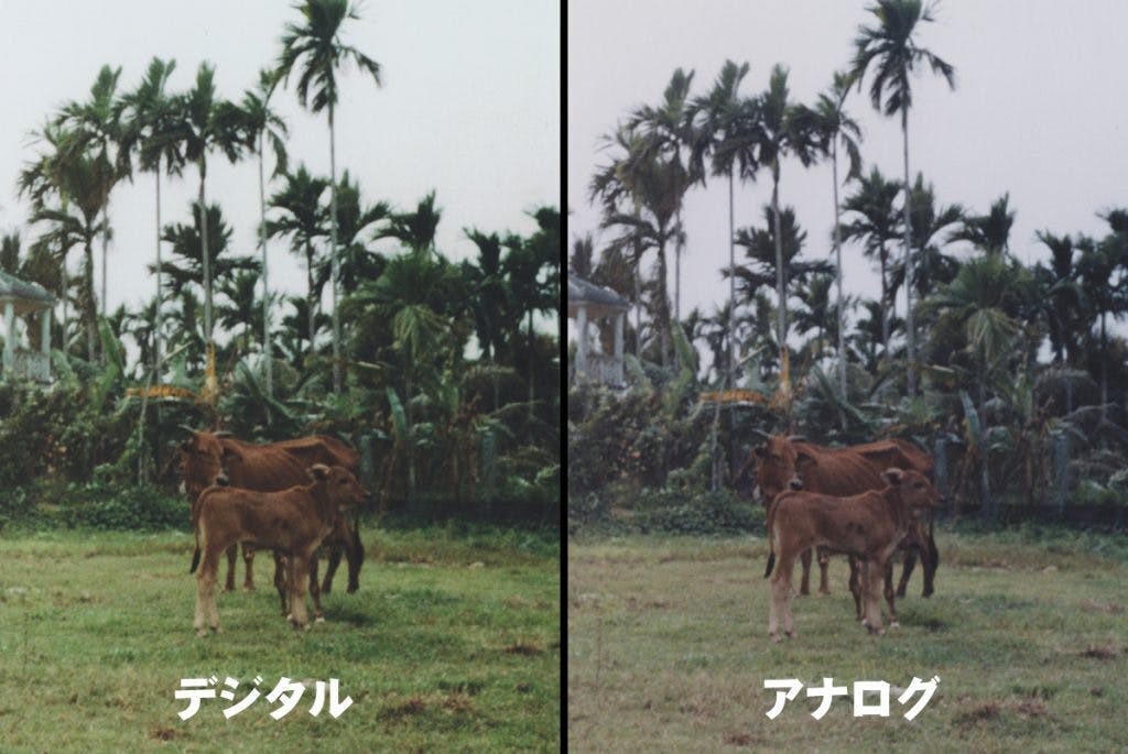 ISO100で夕方にミノルタのコンパクトカメラで撮ったものですが、牧草はあくまで緑色で牛の親子もくっきり鮮明に見え、木立の緑も鮮やかですが、どれを見ても撮影者は不自然で、アナログの方は牛が食べた牧草の雰囲気はこれです。という印象を語ってくれました。