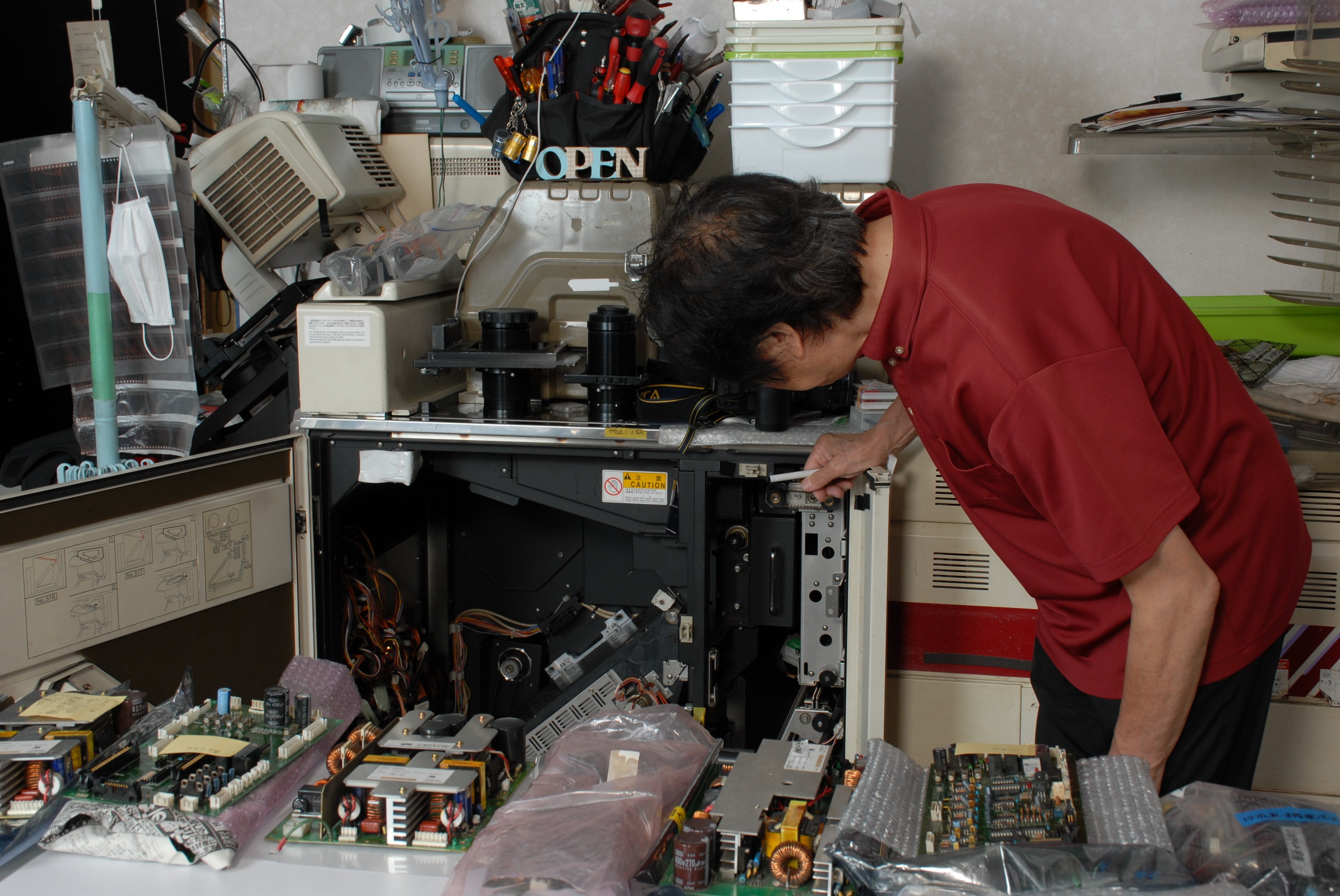 アクティブスタジオでは、全国でも数少ない、フィルムをデジタル化せずにプリントできるミニラボ機を稼働しております。フィルムの性能を最大限に発揮することができる、「アナログプリント」を、他のDPEショップと同価格で実現するためのミニラボ機「QSS-23型」を維持してまいりました。電気系の基板が重要となるアナログプリンターですが、基板の不具合が重なり、新たな部品取り用のQSS-2301型を調達しなければアナログプリントの継続が困難になりました。