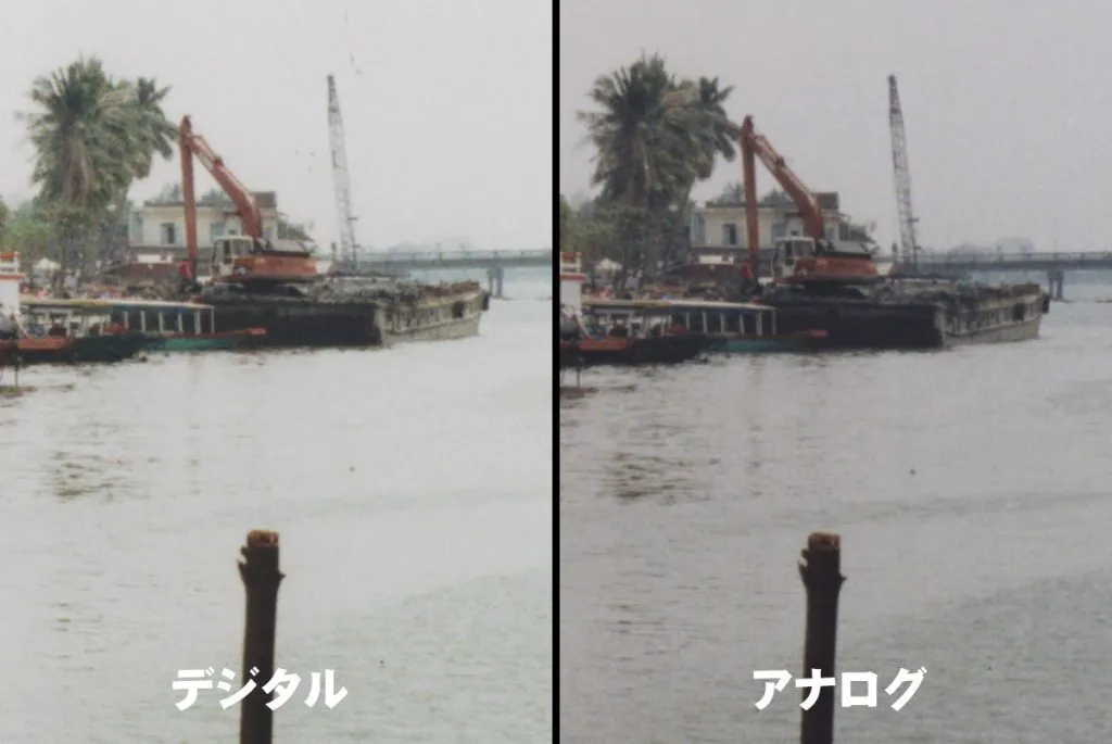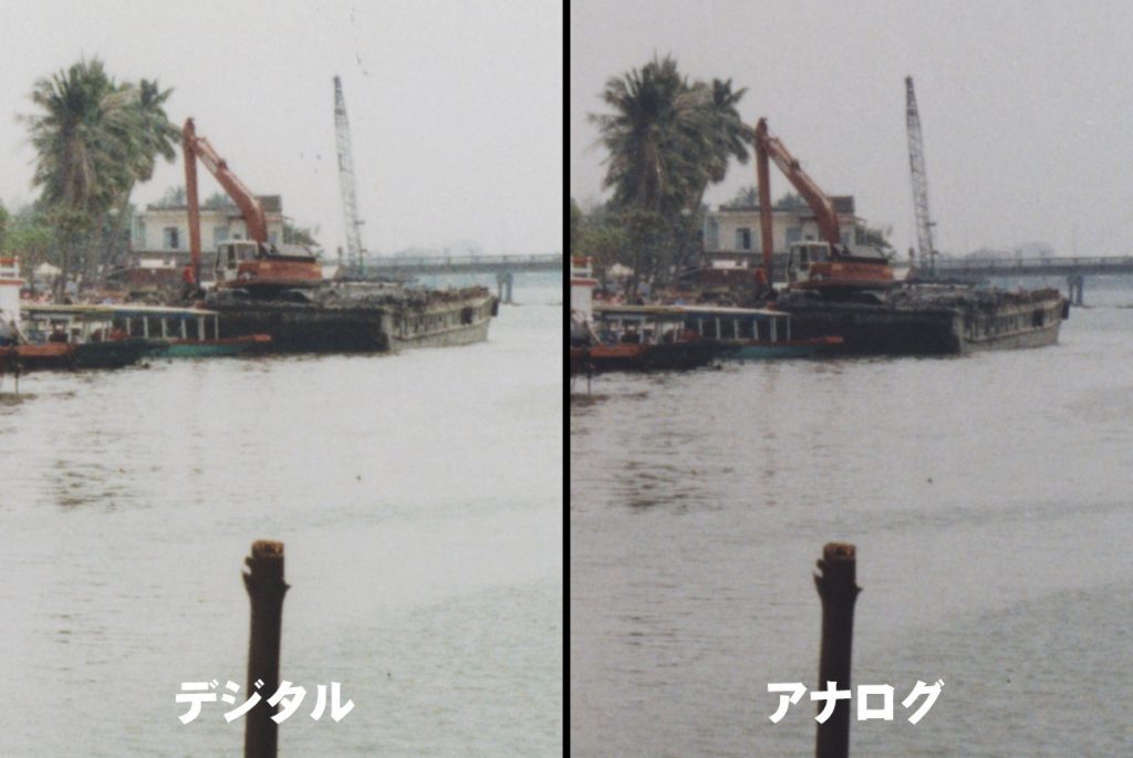 デジタルでは暗部がつぶれハイライトははねて飛んでいます。水面のハイライトはとんでいて暗部がつぶれています。それに対しアナログでは遠景の舟やクレーン船また木立が力強く生々と写し出されています。