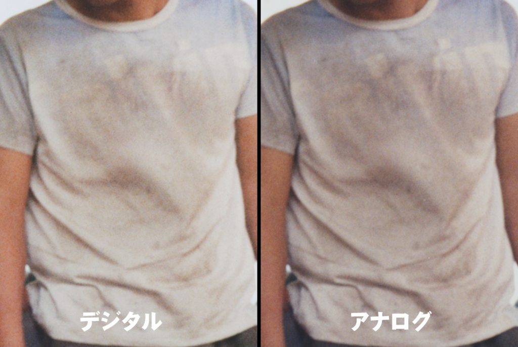 アナログプリントでは再現できていた服の汚れが、デジタルプリントでは汚れが薄まっています。アプリ・ファームのなせる技なのでしょうが、アプリは数年に一度更新されるようですが、デジタルプリントのベテランの技術者は、旧アプリでプリント保存しておいたものと、更新したアプリと比較すると、鮮鋭度とシャープネスは増すばかりで勢いは止まる様子はない。 と教えてくれました。