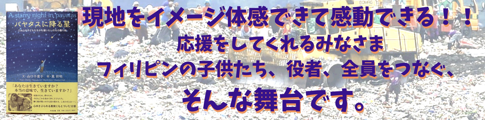 また、日本にいて舞台を見たくても見に行けない子供達へ「舞台のチケットをプレゼントできる権」も用意します。 より多くの方に、フィリピンのゴミ山に住む子どもたちの現状を体感いただき、彼らへの学資支援を集めたいと思っています。
