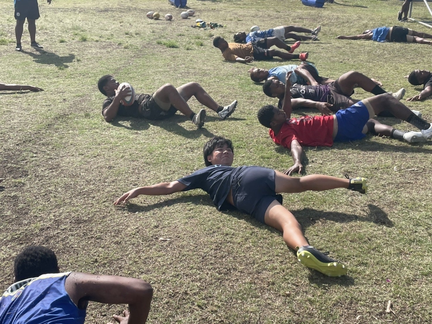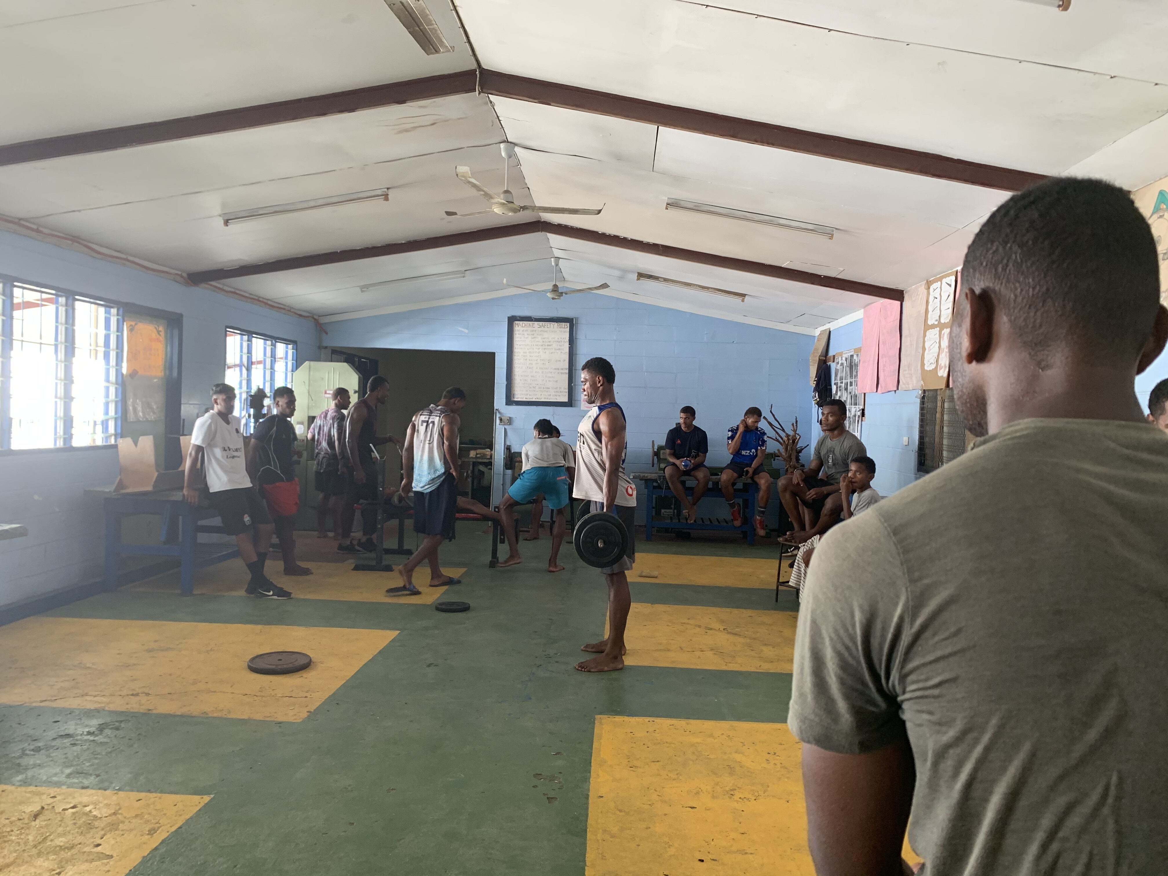 近隣国のニュージーランドやオーストラリアに連なる強豪国のフィジーですが、まだまだ発展途上国で日本や近隣国に比べるとジム器具が選手の人数と比べて足りず整備されていなかったり、ボロボロのタックルダミーやボールを長く使用しています。
