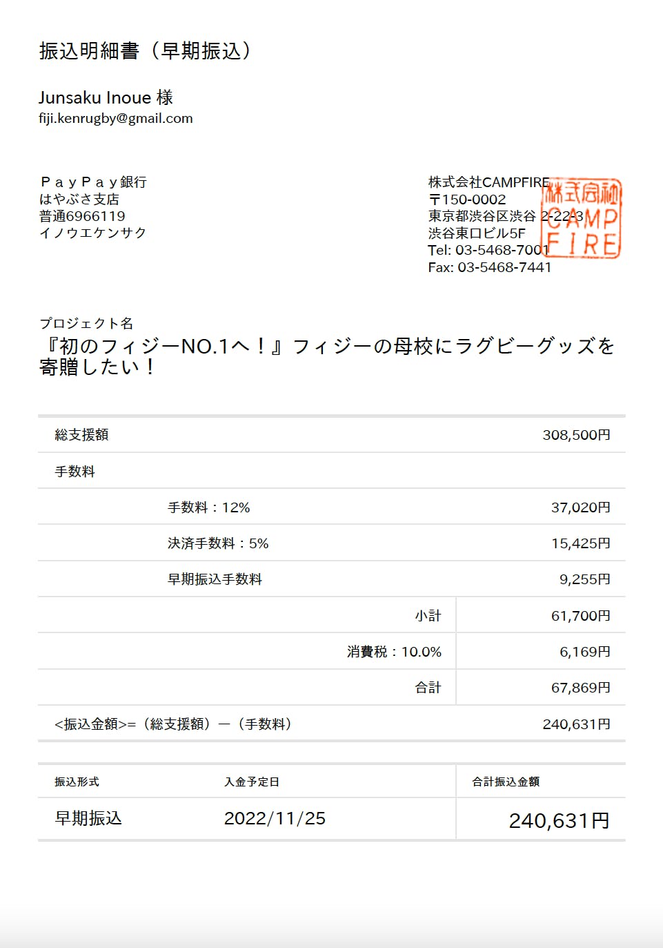 2022/11/30 18:16こんにちは!プロジェクト代表の井上准作です!先日無事に初のクラウドファンディングが終了し、なんと合計308,500円の支援をいただきました!!!目標金額を大きく超える金額が集まり支援、拡散、そして応援してくださった皆さま本当にありがとうございます!私たち二人では到底達成することができなかったフィジーの母校への恩返しプロジェクト。きっと皆さまからの支援で母校のラグビー部員全員が喜び、そして初の全国制覇に向けての活力になると思います。先ほどCampfire様から手数料等を差し引いた240,361円、すでに学校責任者Josese Bisavakaucaの方に送金済みでございます。これからの動きですが、スケジュールにも記載されている通り監督、代表、私井上准作の3人で希望したラグビーグッズの購入をスポーツショップにて行います。ラグビーグッズ購入が全て完了次第、正式にラグビー部へグッズ寄贈となります。そしてリターンの件ですが、すでに支援者皆さまの名前入りの記念ポスターの作成に取り掛かっており、完成はラグビーグッズが寄贈された後を予定しています。よって、掲載自体は12月後半から来年1月になるかと思われます。3000、10000円のプランを選択された皆さま用のお礼ビデオは撮影済みですので、順次お送りしていきます。今しばらくお待ちください。次回はラグビー部にグッズが寄贈されたタイミングでのご報告となります。改めまして、皆様の貴重なご支援誠にありがとうございました。次回の報告も是非お楽しみに待っていてください! もっと見る