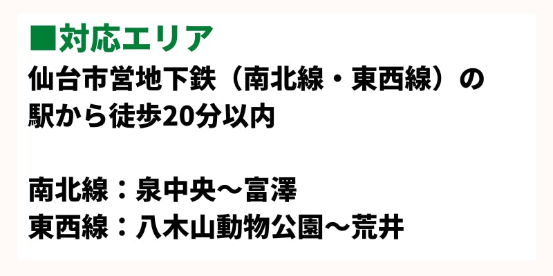 安定したサービスを提供するため、現時点ではサービスの提供エリアを地下鉄南北線・東西線の駅から徒歩20分以内の場所に限らせていただきます。私は車の免許を持っていないで徒歩・地下鉄・自転車で行ける範囲を提供エリアです。