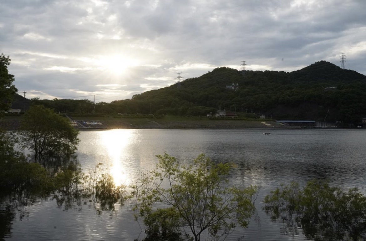 テント内からは大きな湖【入鹿池】が見えます。
