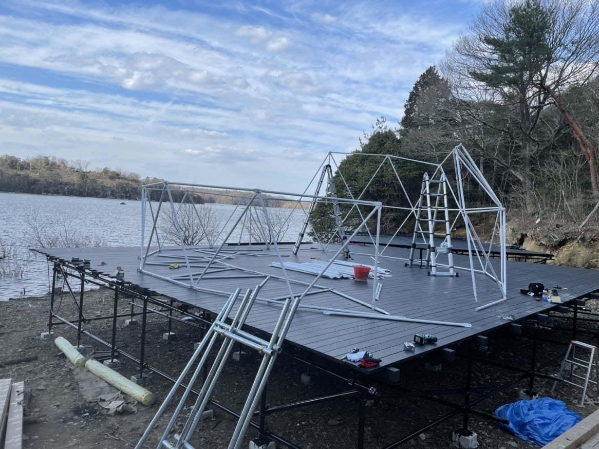 施設基礎工事、デッキ貼り、安全手すりの設置、ドームテント組み立て、家具や備品の設置と進めていきます。
