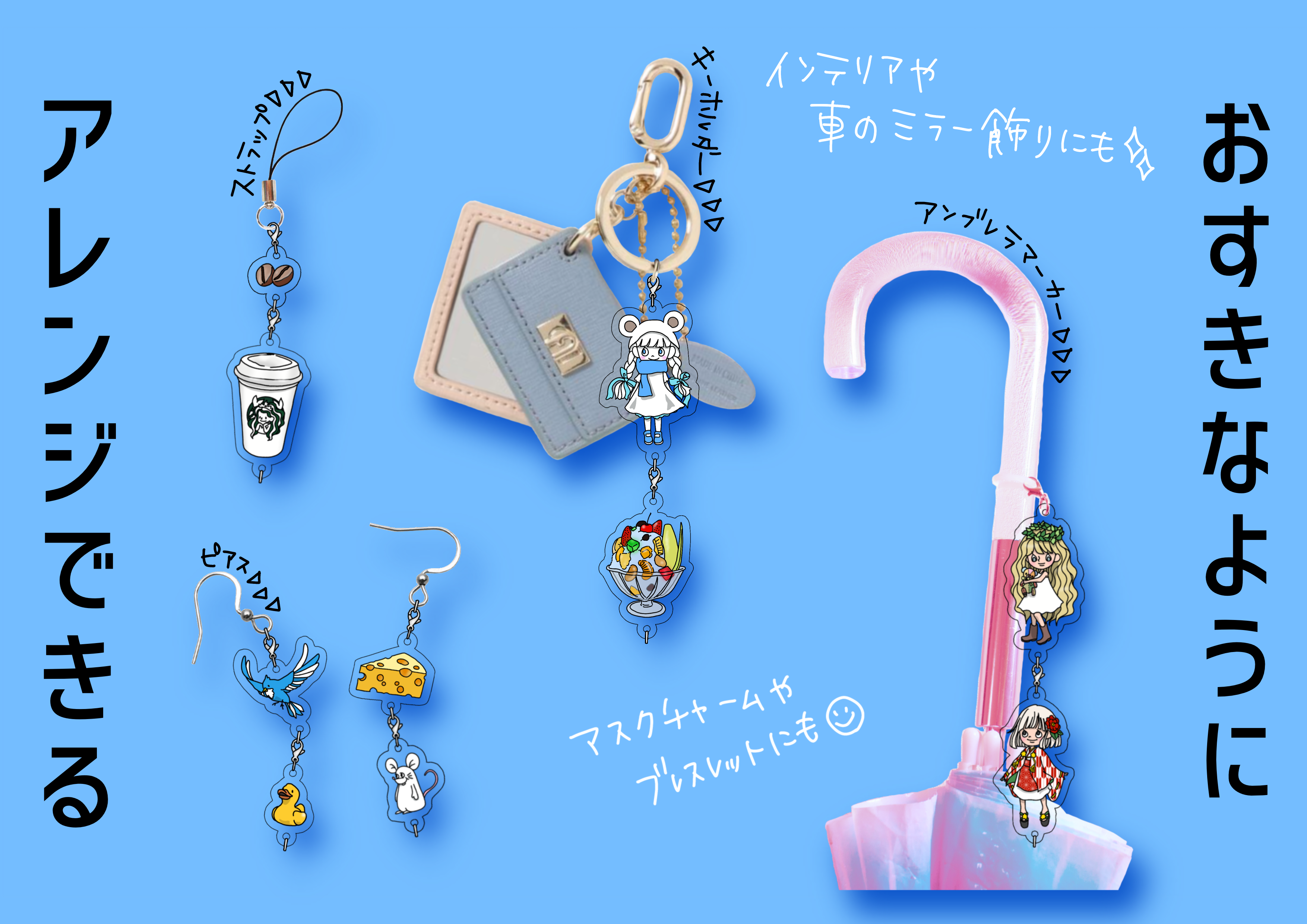 すきなパーツを選んで、自分だけのオリジナルキーホルダーにしたり、アンブレラマーカーにしたり、楽しみ方は色々!