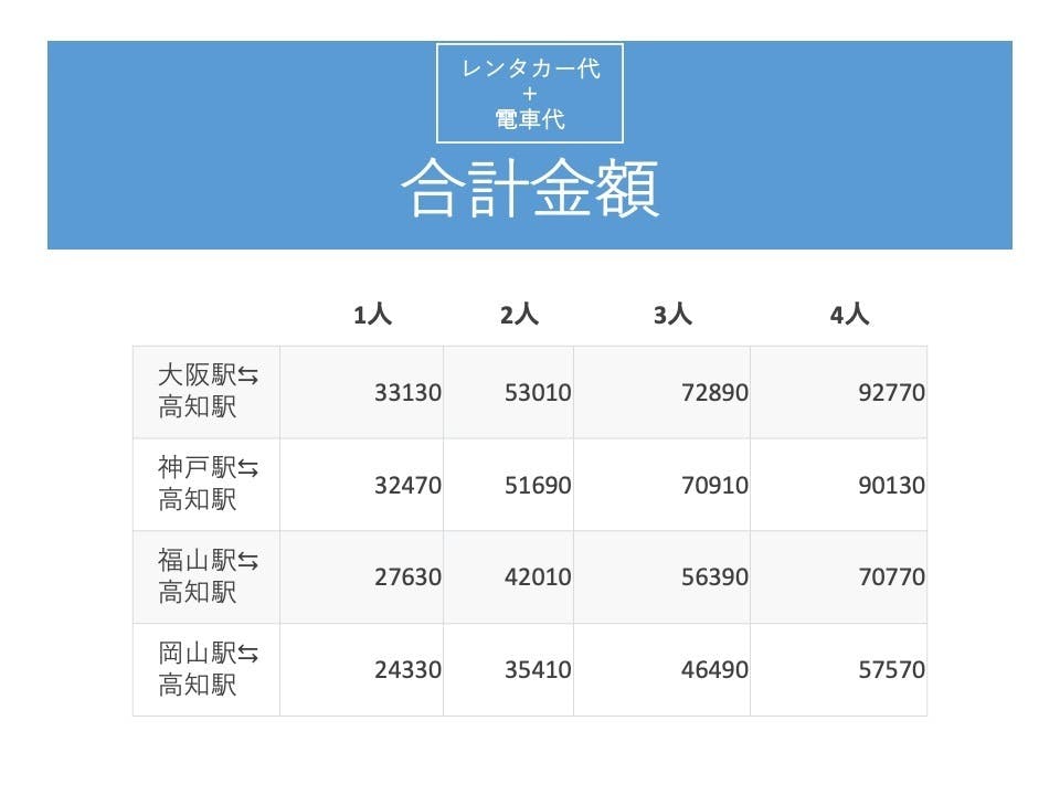 料金は以上の通りで、4パターン考えています。・高知県外(※1)での受け渡しの場合・高知県外で受け取り高知県で乗り捨ての場合・高知県で受け取り高知県外で乗り捨ての場合・高知市内で受け渡しの場合