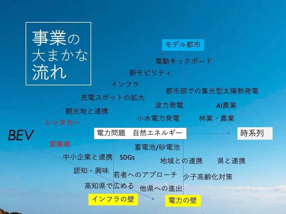 そこで貸し出す車は BEV(Battery Electric Vehicle)に限定し、BEV専門のレンタカー企業を発足します。観光施設やホテルとタイアップし、充電スポットを各地域に設置。企業がBEVの広告塔となってくれれば県民へのアピールになり、県民の興味・関心につなげられると考えています。BEVを使いやすい街にし、県民のBEV購入を促進することで高知県で走る車の100%をBEVにしたいと考えています。