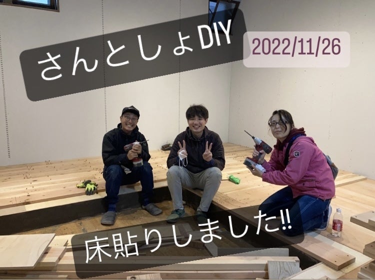 さんとしょDIYワークショップ床を貼る日4日目11月26日にさんとしょの床を貼るワークショップを開催しました!午前中に床板の下準備を一斉にして、午後からは本格的に床板を貼っていきました。初参加の方も来て頂き、「床を貼るなんて中々できる経験じゃないから楽しいです!」と楽しみながら作業することができました。肝心の午後の作業風景を動画に撮るのに失敗してしまったのですが、、、タイムラプス動画をご覧頂ければ床板の動きが良く分かりますよ!来週も引き続き床の作業が続きます!そろそろ前半で貯めた余裕がなくなってきたので、ゲリラ作業が必要かもしれません…行くかどうか迷っているあなた!12/3に是非お越し下さい!!