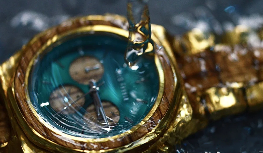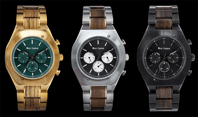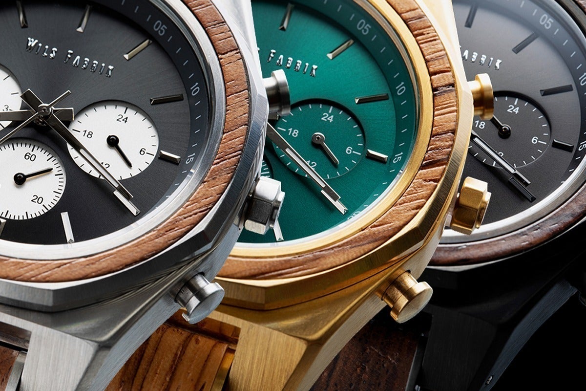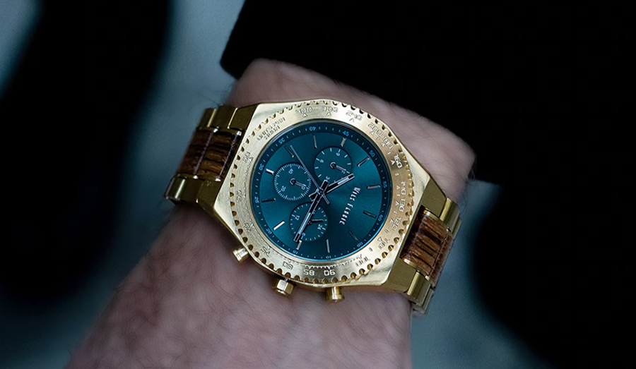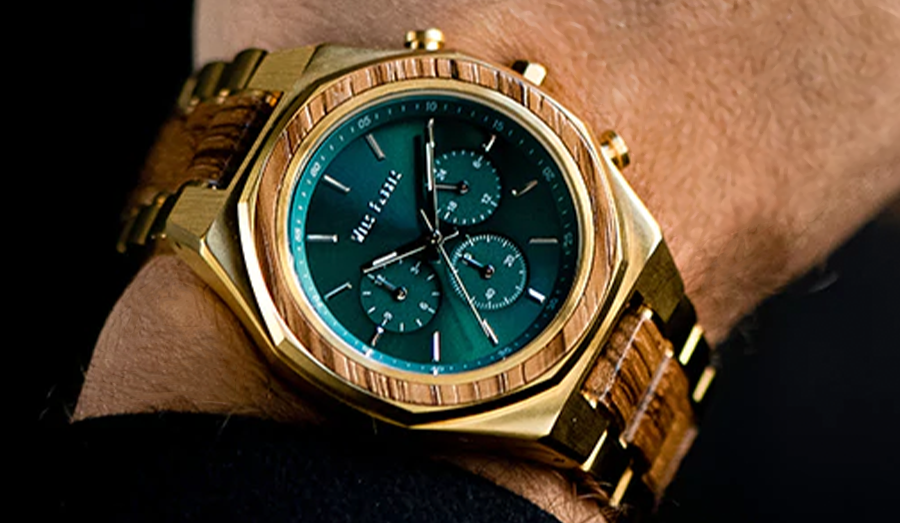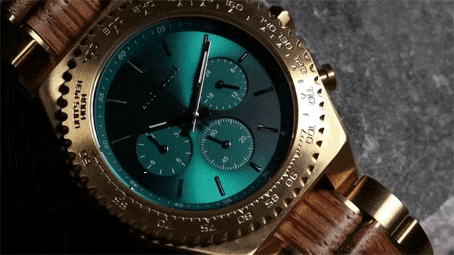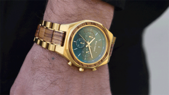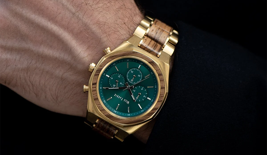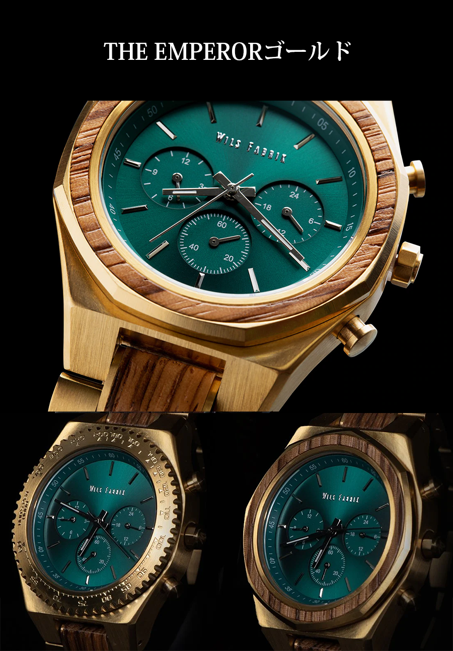 木目がはっきり見えるシマウマウッドと砂金ステンレスを組み合わせた豪華なデザイン。グリーンの文字盤が鮮やかで印象的。