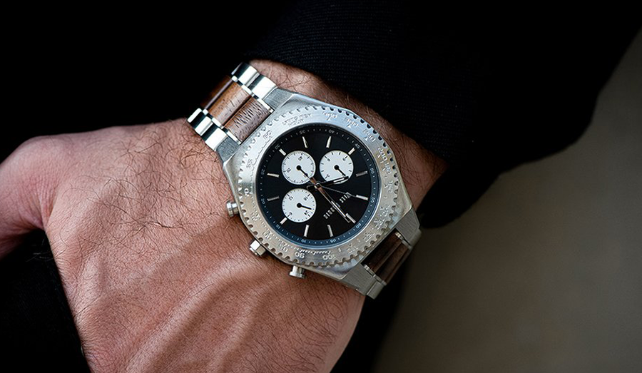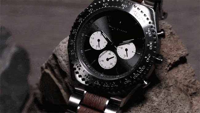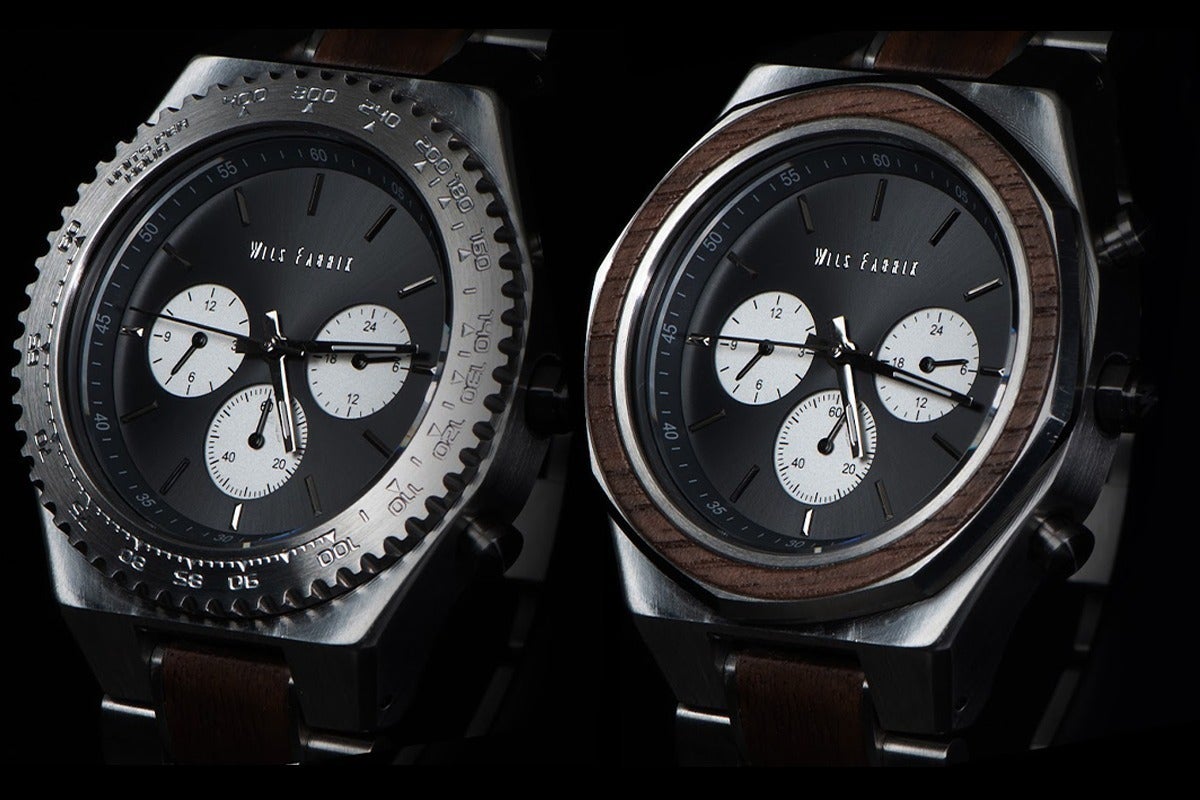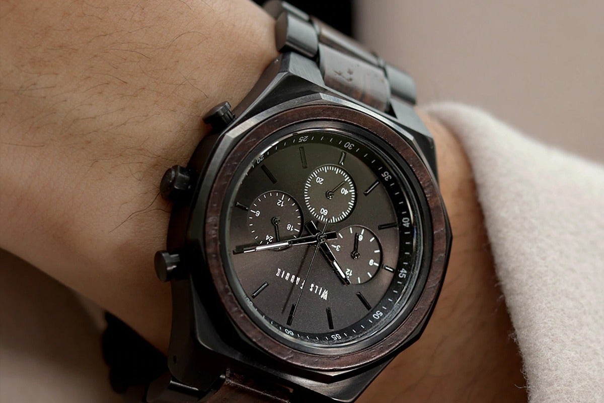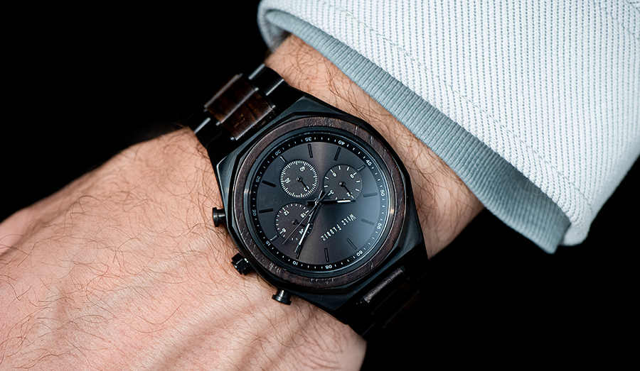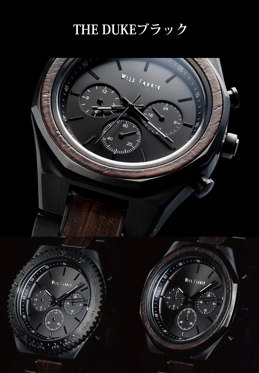 黒檀とブラックスチールのシックで大人な組み合わせ。純白の文字盤の目盛りがアクセント。