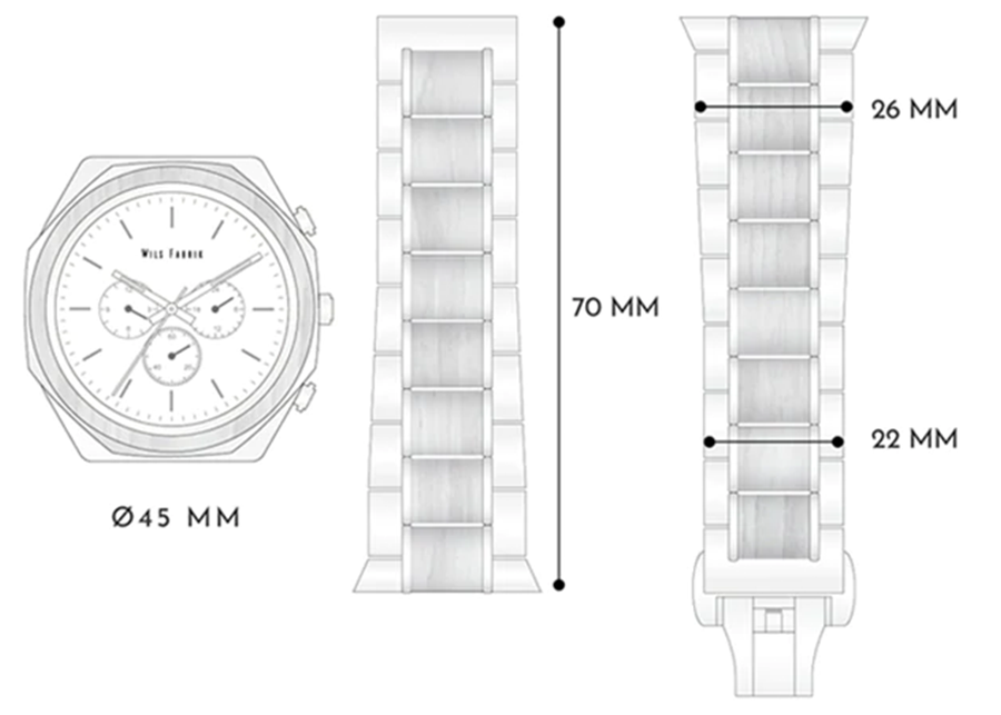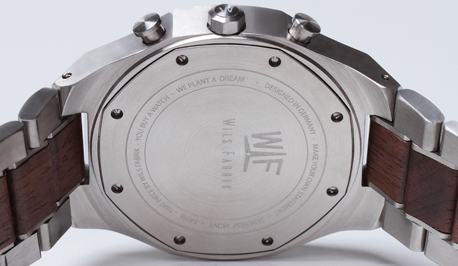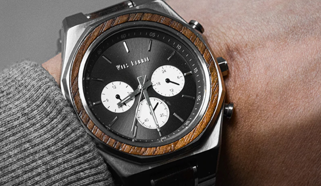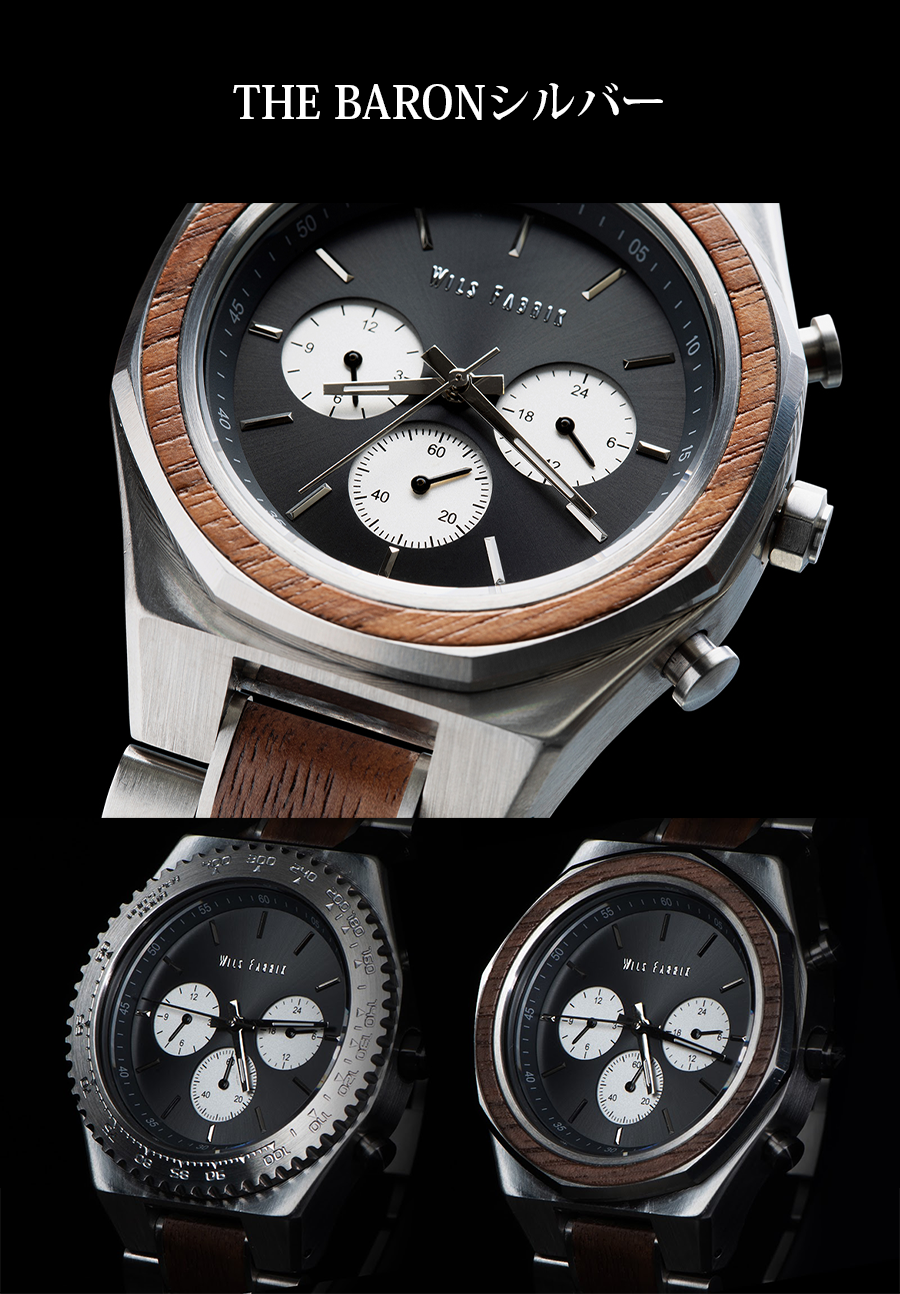 ステンレス製の控えめな銀時計に、くるみの木を組み込むことで温度のある表情を作り、印象深いデザインに。
