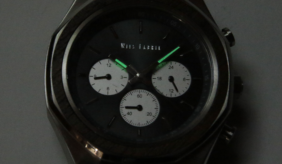 時針と分針には、発光塗料が施されているため、夜間や暗闇でも時刻が確認できます。(明るい時に受けた光を蓄えて、蓄えた光を時間を掛けて放出タイプで、蓄えた光の時間、量によって 発光度合いが変わります。)
