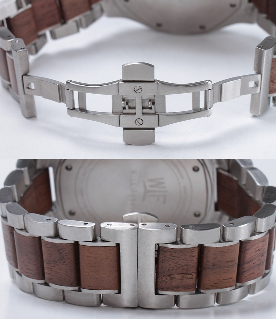 ステンレス鋼と無垢材との間に特製の鋼片を挟むことでお互いの動きを邪魔することなく、滑らかな動きで装着できるベルトに仕上げました。