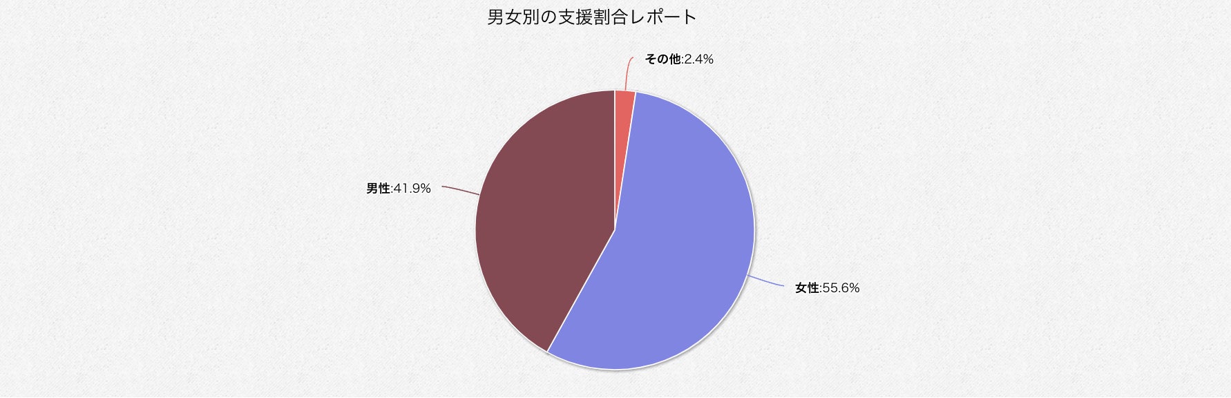 クラウドファンディングでご支援いただいた方の性別は下記の通りでした。女性が「55.6%」、男性が「41.9%」、その他が「2.4%」でした。