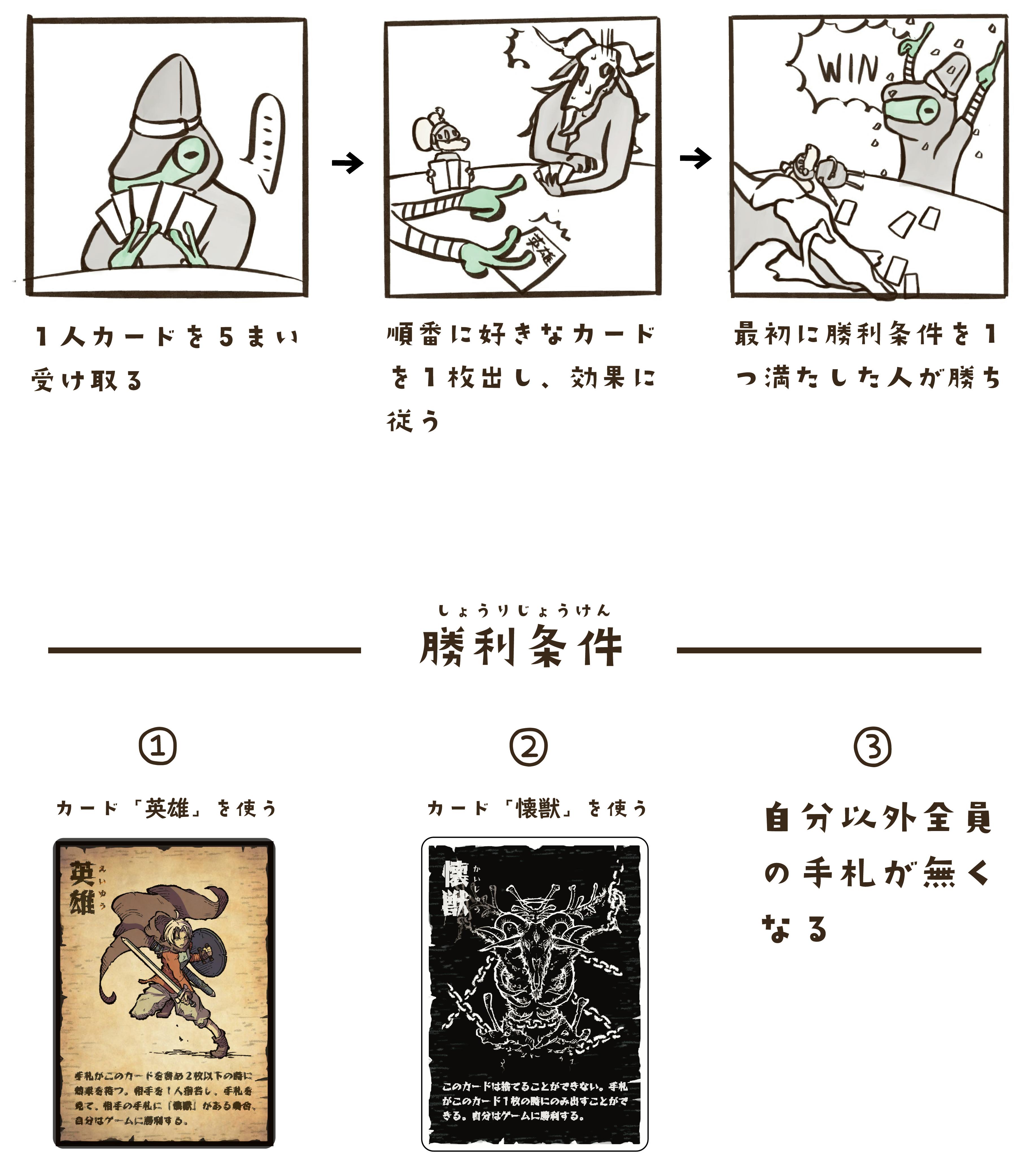 3つの勝利方法から、与えられたカードを駆使し、それらの条件を満たす戦略を考えよう!