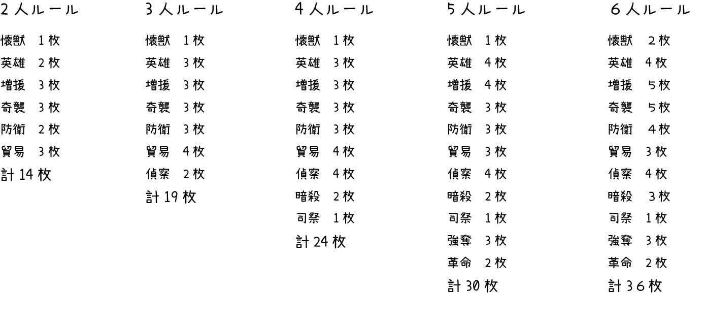 プレイ人数に対応したカードを準備し、それらをまとめた山札を用意する。