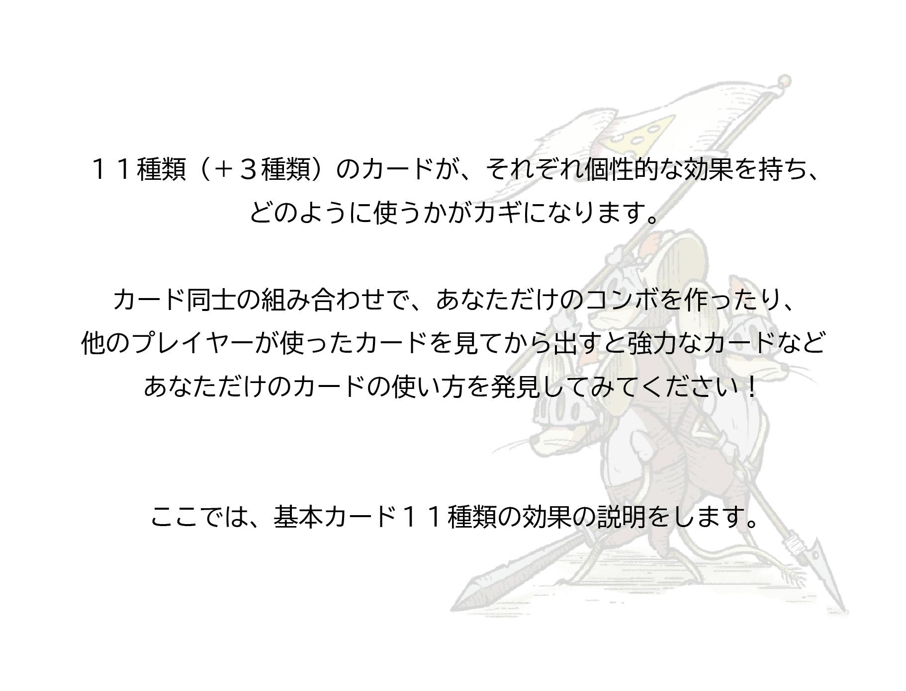自分の手札に配られた、動物をモチーフとした兵士達のカードはそれぞれ役立つ効果を持っています。戦略を立て、他のプレイヤーが使ってくるカードを予想しながら戦います。