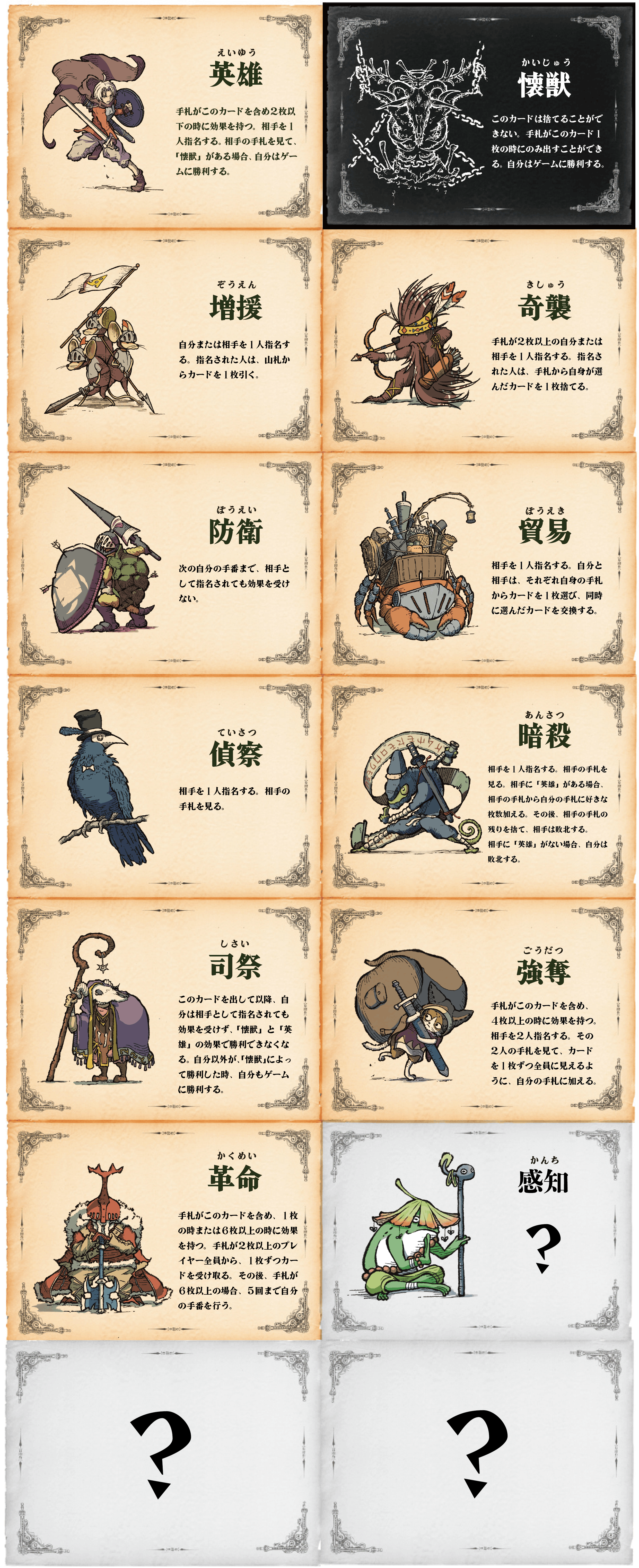 11種類のカードと3つの勝ち方、他のプレイヤーの手札、山札にあるカードの予想など様々な要素が絡み合った、一見シンプルながら考えると奥が深い、運も実力も必要となる初心者から上級者まで楽しめるゲームです。