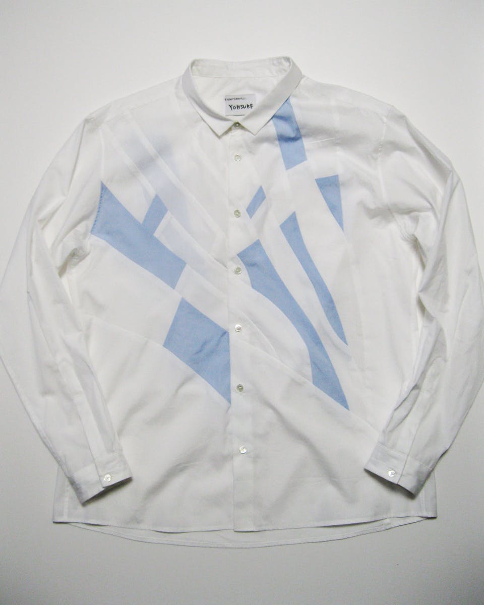 青の生地の色がとても好きでこの生地を洋服にしようと思い、何度も線を引いてこの形を導き、シャツの上に自由にデザインしました。