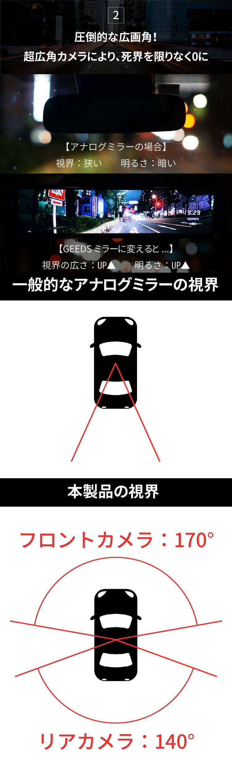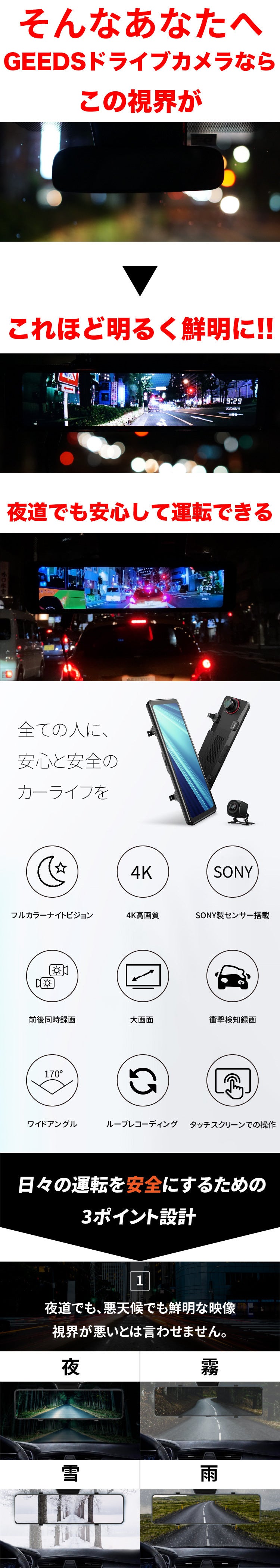 高齢化社会が進み、高齢者の事故が相次ぐようになってきました。夜道などの視界が悪い中での運転に不安を抱えている方も多いと思います。GEEDSドライブレコーダーによって悪視界の中でも今までより安全・安心に運転ができるようになることを願っています。これまでミラー部分のみの設置やダッシュボードのみの設置のみにしか対応していないドライブレコーダーがほとんどでしたが本製品はどちらの設置にも対応していますので、幅広い方々に使っていただけますと幸いです。これからも消費者の皆様の生活が便利になる製品を紹介していきたいと思っております。本製品の補償に関してですが、製品の配送時期から3ヶ月間に関しては破損や故障に対する返品・返金を対応させていただきます。よろしくお願いいたします。