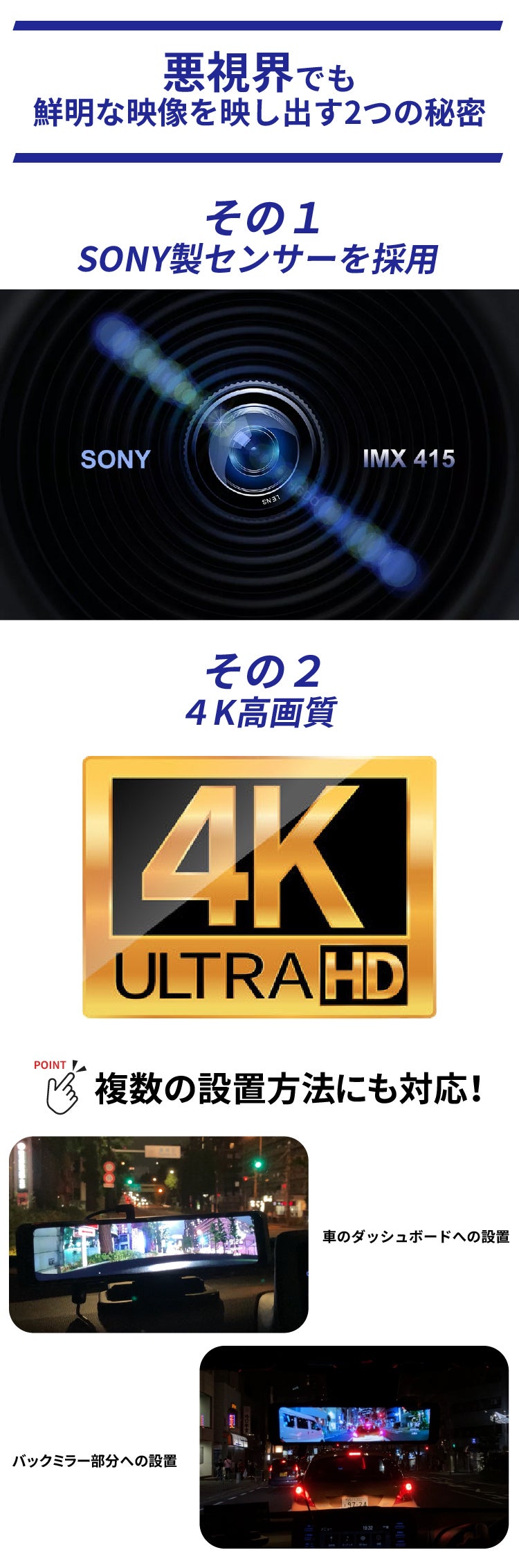 カメラはSONY製のセンサーを搭載しており、画質は4Kの高画質。車のナンバーも鮮明に映し出すことができます。